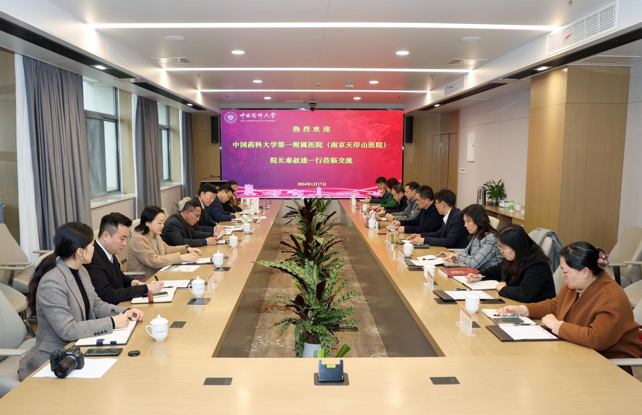 1月18日,beat365官方网站第一附属医院(南京天印山医院,以下简称第一附属医院)院长秦叔逵一行来校学习交流。校党委书记金能明、校长郝海平、副校长杨勇,校长办公室、科学技术研究院、人事处、教务处、研究生院及现代制药产业学院等单位负责人参加交流会。会议由副校长杨勇主持。