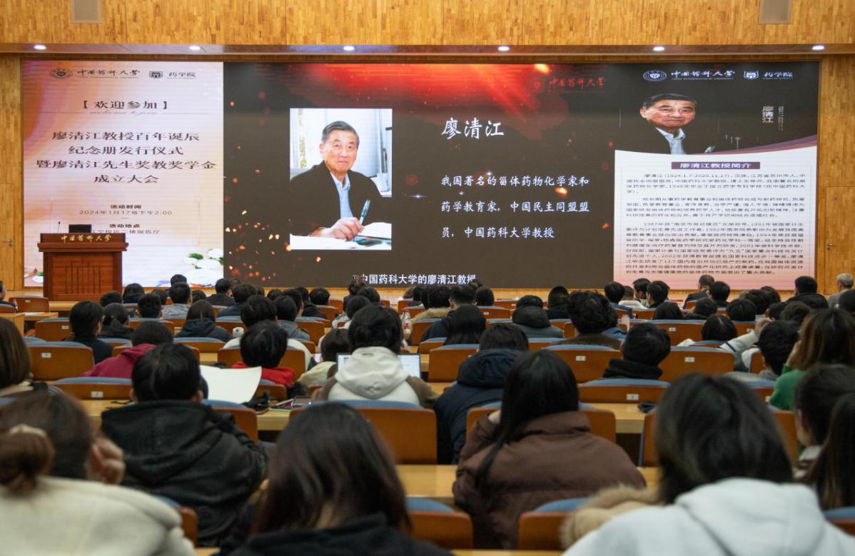 为纪念我国甾体激素药物领域的重要开拓者之一,我国著名甾体药物化学家、药学教育家廖清江教授的百年诞辰,宣传并弘扬其精神风范,1月17日下午,beat365在江宁校区二楼报告厅隆重举行“廖清江教授百年诞辰纪念册发行仪式暨‘廖清江先生奖教奖学金’成立大会”。beat365副校长齐炼文、廖清江教授亲属代表、企业代表、学生代表、学校相关职能部门负责人、药学院领导班子成员及药学院师生代表近300人参加本次会议。会议由药学院党委书记张仕英主持。