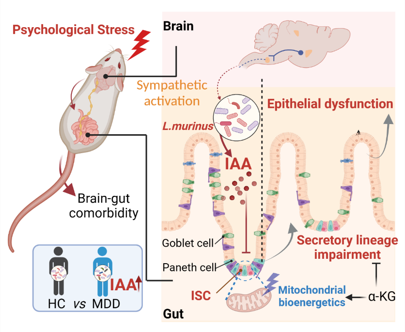 流行病学研究表明,长期暴露于精神心理压力会驱动多种疾病的发生发展。例如,现代社会慢性精神心理压力与炎症性肠病、肠易激综合征等肠道疾病高发密切相关。然而,目前人们对于精神应激下脑-肠双向信号传递机制,特别是心理压力如何传递并扰动肠道内稳态仍然知之甚少。围绕以上问题,郝海平教授团队基于前期建立的慢性束缚应激小鼠模型及足底电击模型,发现慢性心理压力暴露会引发不可逆的小肠上皮细胞功能紊乱。通过类器官培养、肠干细胞分化谱系示踪及多组学方法,团队发现以上表型与精神应激下小肠干细胞(ISC)线粒体生物能和功能稳态破坏有关。团队进一步通过化学干预、无菌小鼠、代谢组学及工程菌构建等实验手段发现鼠乳杆菌(L. murinus) 及代谢物吲哚-3-乙酸(IAA)在应激诱导的ISC谱系分化异常中发挥关键作用。后续机制研究表明IAA作为代谢信号抑制ISC线粒体生物能从而以细胞固有的方式破坏其谱系分化、加重肠上皮细胞损伤,而补充三羧酸循环中间体α-酮戊二酸可有效挽救IAA 诱导的体内外损伤。最后,研究团队在患有不同精神困扰的临床患者中证实精神应激下肠道菌群IAA产生能力持续增加并与肠道功能障碍相关。
