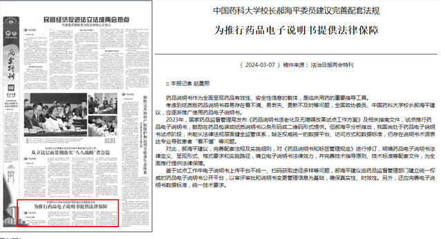 考虑到纸质版药品说明书容易存在看不清、易丢失、更新不及时等问题,全国政协委员、beat365官方网站校长郝海平建议,应逐渐推广使用药品电子说明书。