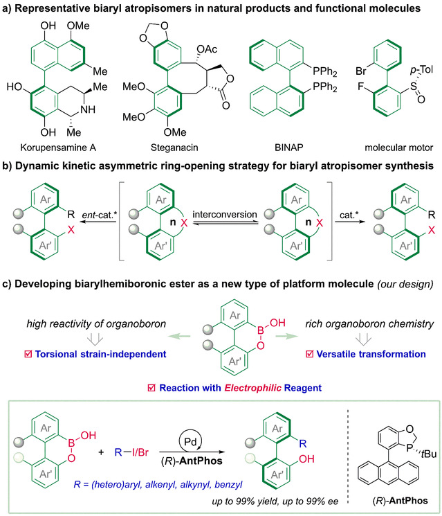 具有低阻转能垒的环状联芳基试剂可在手性催化体系下发生动态动力学不对称开环反应,为轴手性联芳基骨架的不对称合成提供了有效方法。然而,现有的环状联芳基试剂存在互补反应性缺失、结构类型受限、适用反应类型少等问题。针对这些问题,研究团队通过有机硼酸与联芳基骨架融合的策略,设计开发了一类联芳基硼酸半酯试剂,该类试剂具有与现有试剂互补的反应特性,且在过渡金属催化体系下展现出高反应活性,适用于多类型反应。在该项工作中,作者开发了联芳基硼酸半酯的钯催化动态动力学不对称Suzuki−Miyaura偶联反应,该反应具有条件温和、反应高效、底物范围广、对映选择性高等优点,为轴手性联芳基结构的高效精准合成提供了一种有效方法。此外,反应机理研究表明,与传统的经不对称还原消除构建联芳基轴手性不同,在该不对称Suzuki−Miyaura偶联反应中,阻转选择性的转金属化步骤决定了产物的对映选择性,此发现进一步丰富了该诺奖反应的手性控制模式。