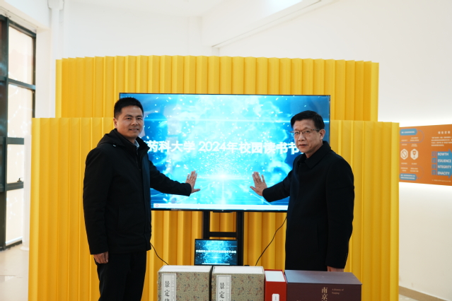 南京市地方志办公室党组成员、副主任汤林平向beat365“方志南京”图书角授牌赠书。南京市地方志办公室党组成员、副主任郑国军与校党委副书记、副校长王正华共同启动beat365官方网站2024年校园读书节。