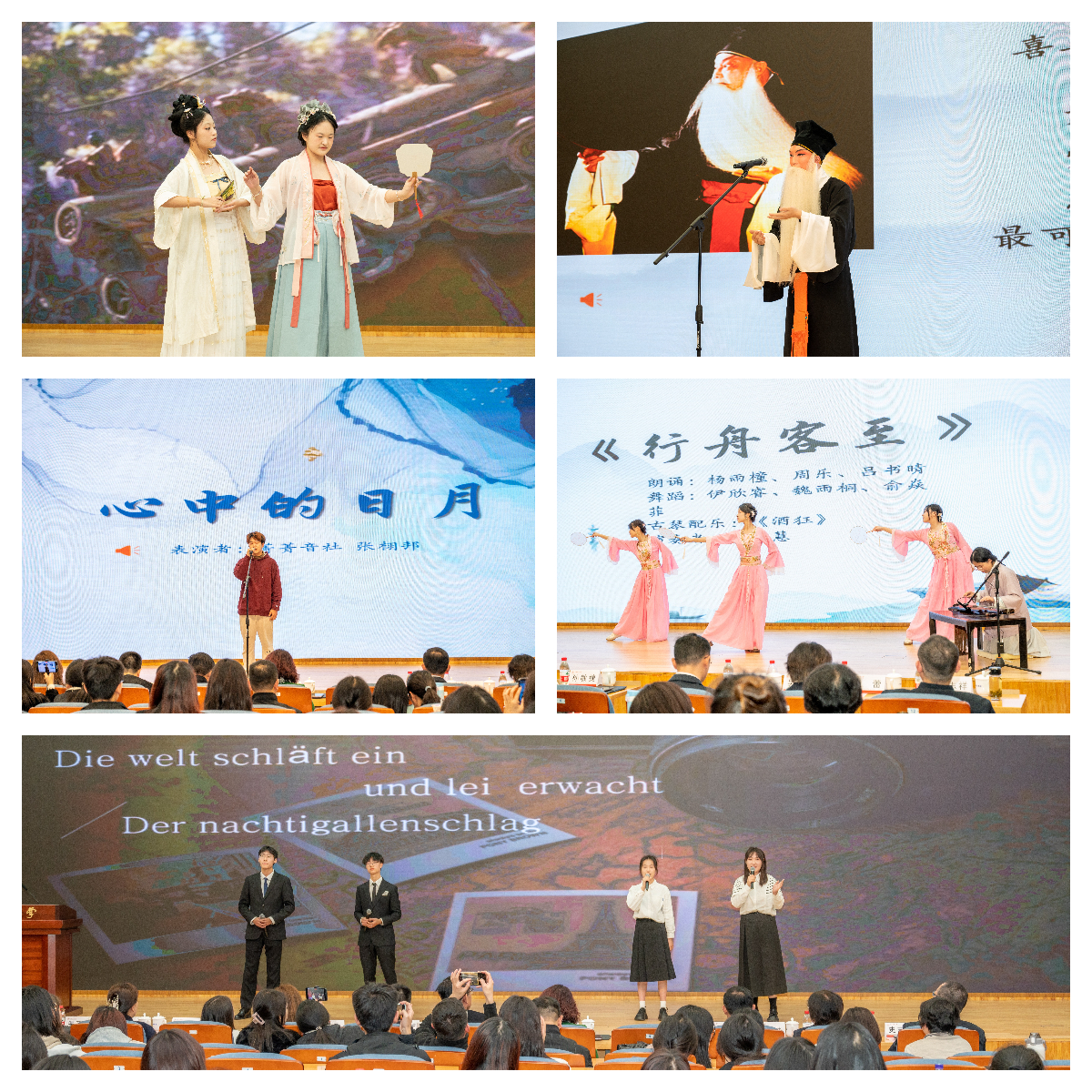 在随后的文艺汇演环节,京剧表演、传统舞蹈、汉服走秀等富有中国传统文化特色的文艺节目为在场师生带来了一场视听盛宴,最后外国语学院学子用中、英、德、法多语种合唱的《友谊地久天长》将现场气氛推向高潮。