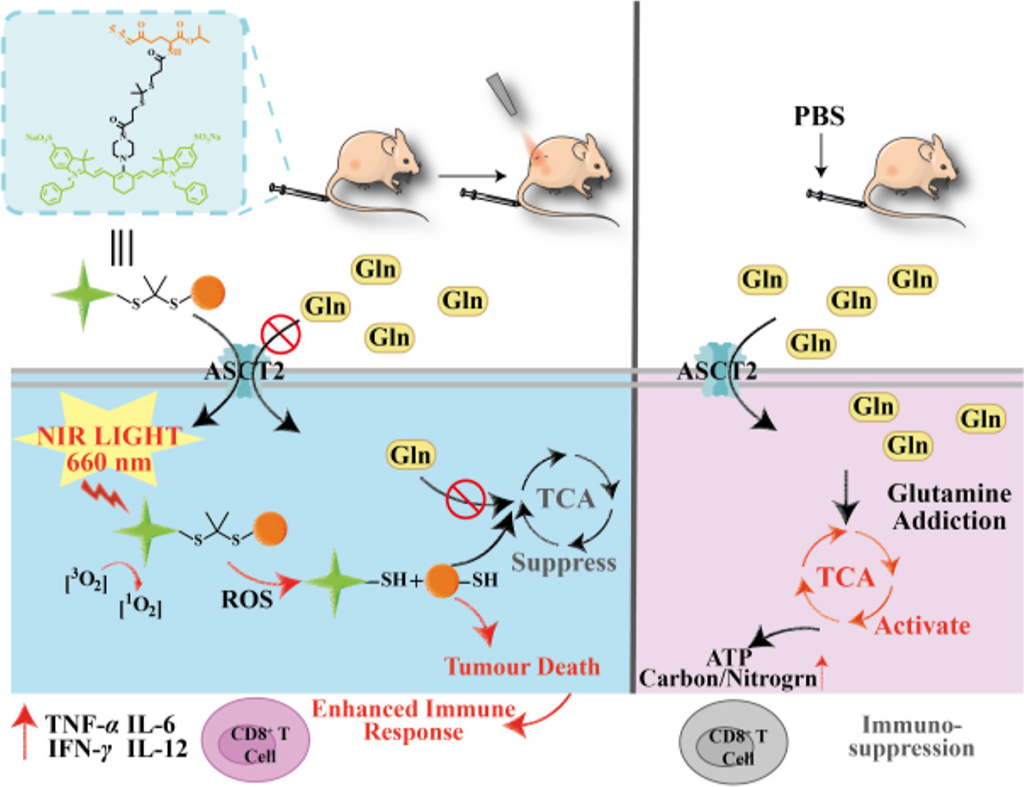 光触发前药以其非侵入性以及可操控性,在肿瘤治疗领域展现出巨大的应用前景。而近红外光也因其能量低、对组织损伤小、高组织渗透性等优势成为光疗的首选光源。本研究设计合成所得的最优化合物结构为DON-TK-BM3——将异丙基保护的DON 通过ROS响应型硫缩酮链(TK)与花菁染料进行结合。在近红外光的照射下,花菁染料产生单线态氧使TK链发生断裂,释放出DON药物以及花菁探针。这一设计不仅实现了DON在肿瘤组织中的精确靶向积累,优化了药物的释放机制(“如何释放”),还通过药物释放前后的结构变化,改变了荧光光谱,提供了释放时间(“何时释放”)的精确信息。体内活性研究进一步证明,DON-TK-BM3不仅实施了一种光动力治疗策略,抑制了肿瘤细胞的三羧酸循环(TCA),扭转了肿瘤的免疫抑制微环境,还显著增强了抗肿瘤效果,同时大幅降低了药物的副作用。这些研究结果不仅表明该前药技术在临床应用上的广阔潜力,也为针对癌症代谢靶点的药物开发提供了新的策略方向。