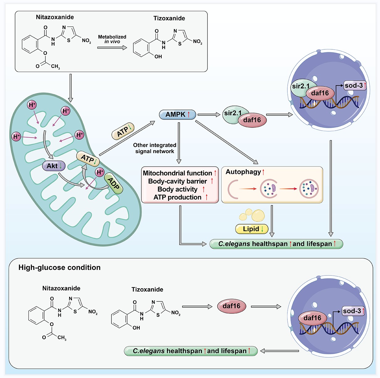 基于以上发现,董德利教授、孙志洁教授课团队以秀丽隐杆线虫为模式生物,进一步研究了硝唑尼特及其代谢物替唑尼特的抗衰老作用。发现硝唑尼特及替唑尼特均具有延长线虫寿命的作用,还可降低线虫衰老相关指标脂褐素水平,改善肠道通透性,增强线虫运动能力和线粒体功能。通过使用多种基因突变型线虫,本研究确定硝唑尼特及替唑尼特通过Akt/AMPK/sir2.1/daf-16信号通路和AMPK介导的自噬功能增强延长线虫寿命;此外,硝唑尼特及替唑尼特还可改善高糖诱导的线虫寿命缩短。硝唑尼特是一种具有良好安全性的临床药物,该团队首次提出硝唑尼特可能是一种潜在的抗衰老及衰老相关性疾病的药物。