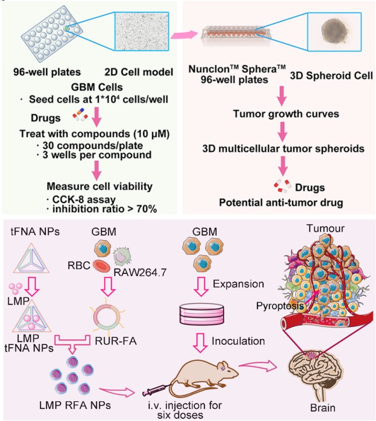 该团队通过高通量药物筛选平台从1430个小分子化合物中筛选得到一种新型抗神经胶质母细胞瘤(GBM)药物洛美他派(LMP)。此外,他们构建了一种主动靶向GBM的仿生纳米给药系统(RFA-NP),该系统主要以负载LMP四面体DNA纳米笼(tFNA-NP)为核心、以叶酸修饰的红细胞-癌细胞-巨噬细胞杂化膜(FRUR)为外壳所组成。结果表明,LMP-RFA-NPs在荷瘤小鼠中表现出优越的抗GBM活性,减少脱靶效应,显著延长GBM模型小鼠的寿命,并且副作用可以忽略不计。该研究将高通量药物筛选与仿生纳米给药系统技术相结合,为GBM治疗的药物开发和临床治疗策略优化提供了理论和实践依据。