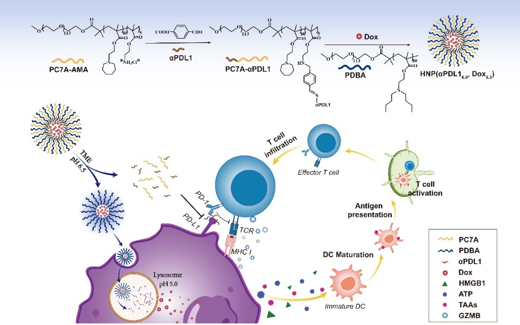 免疫检查点抑制剂与化药联合已成为临床治疗肿瘤的一线方案,然而两种药物具有不同的空间作用位点需求:分别起效于肿瘤组织外液与肿瘤细胞内部。现有的多药共递送系统大多同时释放荷载药物,难以兼顾二者在空间水平最佳释药位点的平衡。该团队利用两种不同pKa的高分子聚合物作为载体,制备了pH逐级响应型释药递送纳米胶束平台,并以αPDL1和Dox为模型药物组合,验证了其化疗-免疫疗法中的空间协同作用。