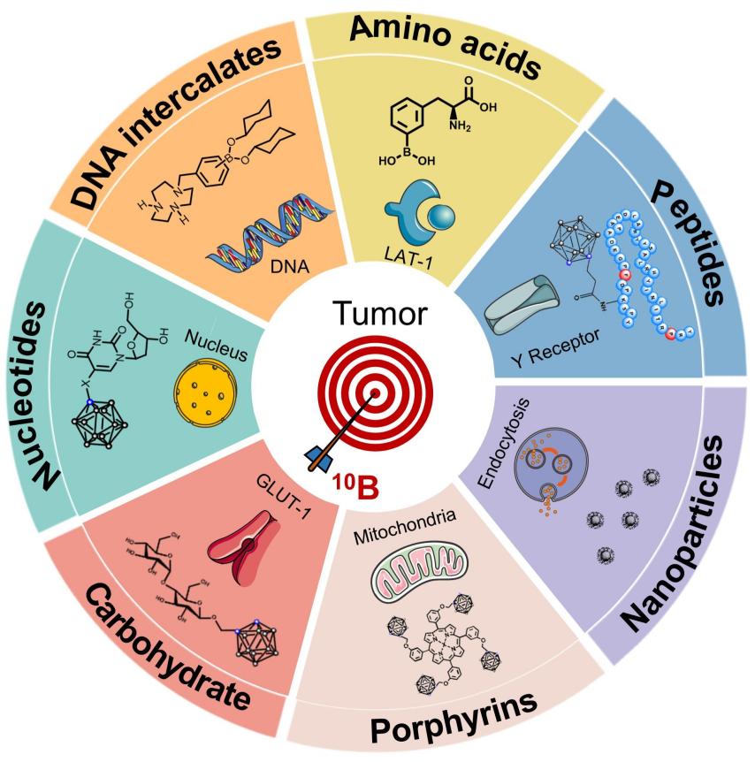 BNCT的临床疗效已在局部侵袭性肿瘤(脑胶质瘤,黑色素瘤,骨肉瘤等)中显示出巨大潜力,其中一个关键技术是含硼药物的研发。目前,BNCT中使用的主要硼携带剂是4-二羟基硼基-L型苯丙氨酸(L-10BPA)和Na210B12H11SH(BSH)。前者含硼量低,需要反复给药,而后者缺乏肿瘤选择性,产生较大副作用。该团队就近十年来各种硼载体的研究现状进行了综述。这些载体可以根据不同的设计策略进行分类,包括细胞膜靶向(LAT、GLUT、多肽等),细胞核靶向(核酸衍生物、DNA嵌入剂)、增强渗透性和保留(EPR)效应(脂质体、聚合物、无机纳米颗粒等。该综述为具有应用前景的新型含硼制剂的研发提供了理论基础,将推动这一技术的临床转化和应用。