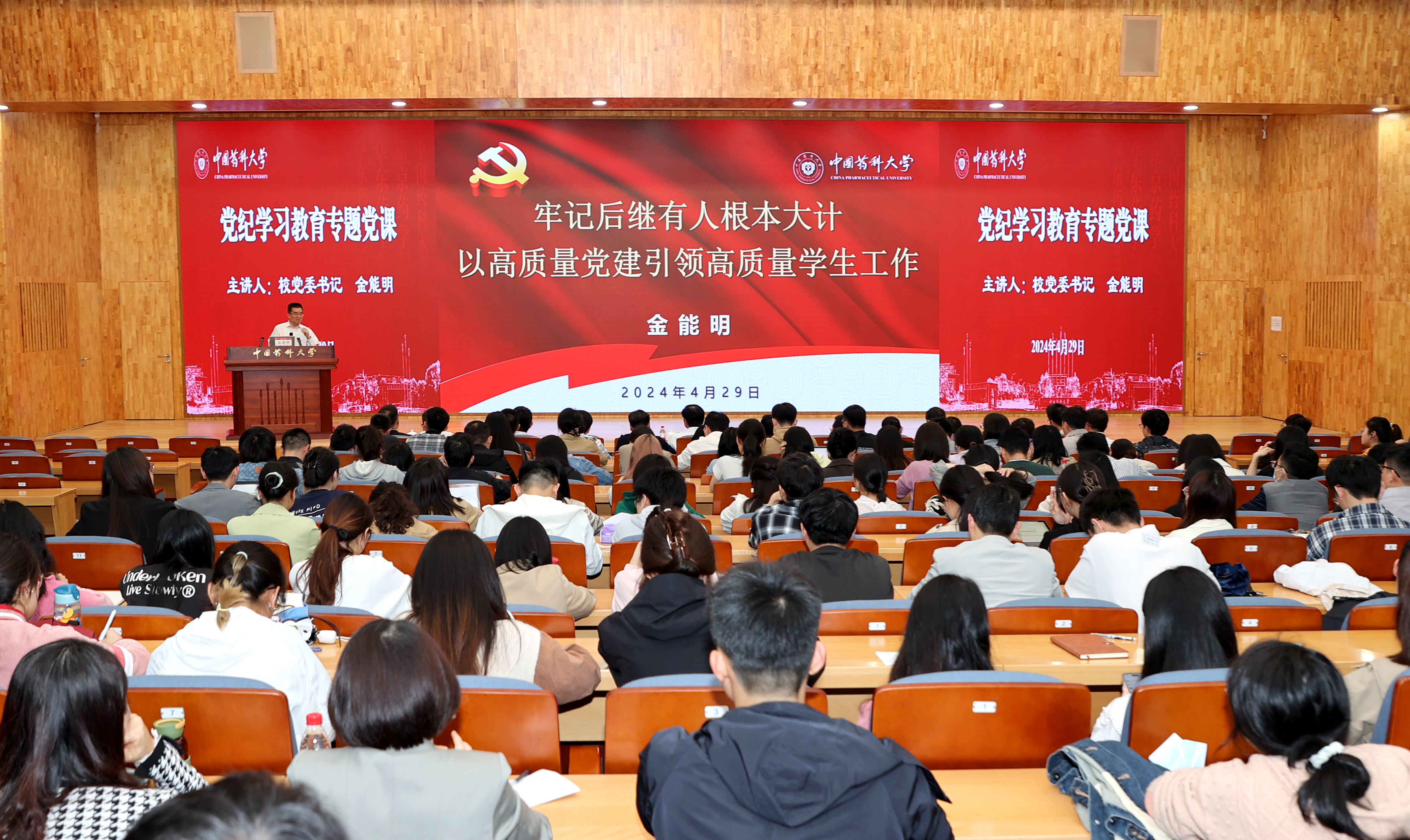 为深入推动党纪学习教育走深走实,4月29日下午,校党委书记金能明以《牢记后继有人根本大计,以高质量党建引领高质量学生工作》为题,在江宁校区会议中心二楼报告厅讲授党纪学习教育专题党课。校党委副书记、副校长王正华,相关职能部门负责人、学院分管学生工作的党委副书记,全体专兼职辅导员、专兼职团干部、组织员以及学生党支部书记参加本次专题党课。党课由学工部、研工部部长杜文清主持。