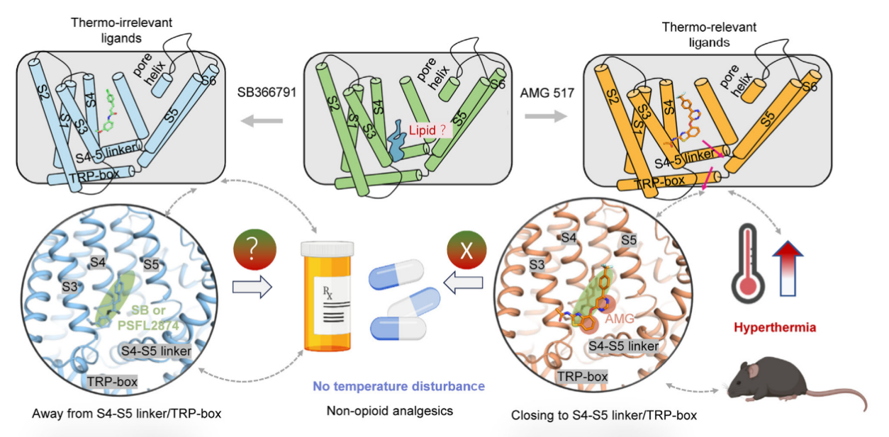 辣椒素(香草素)受体TRPV1是一种非选择性阳离子通道。最初,David Julius教授在探索辣椒素引起痛觉的机制时发现了TRPV1。随后,Julius教授在研究TRPV1如何感知热量时意识到,TRPV1还是一种热敏受体——在感受痛觉的温度下,受体被激活。目前,多种TRPV1拮抗剂候选药物进入了临床试验阶段。不过,TRPV1激动剂/拮抗剂的研发面临一大挑战,即它们往往会引起人体核心体温的剧烈变化,这极大限制了相关药物的使用可能性。至今,为何TRPV1靶向药物在镇痛的同时会引起核心体温的剧烈变化,其中的分子机制尚不清楚。基临院于烨教授领衔的膜生物物理与化学生物学课题组成员在《Neuron》上在线发表的题为“TRPV1 analgesics disturb core body temperature via a biased allosteric mechanism involving conformations distinct from that for nociception”论文为我们解答了这一问题。该项研究工作首次提出TRPV1中在同一位点结合不同配体的细微差别编码了痛觉和体温调节的功能。这一发现挑战了将受体视为简单开与关的传统观点,并突出了通道蛋白也存在连续、偏好性信号编码的受体复杂性,为研发TRPV1靶向且不改变体温的非阿片类镇痛药物研发提供了扎实的基础(图2)。beat365官方网站博士生黄毅哲、博士后孙萌阳、硕士生马静娴、博士生边宇婧为本文的主要贡献者。全文链接如下:https://doi.org/10.1016/j.neuron.2024.02.016