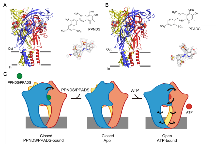 在P2X受体的调节机制方面,该团队同时与复旦大学服部素之团队联合在《eLife》杂志在线发表题为“Structural insights into the orthosteric inhibition of P2X receptors by non-ATP-analog antagonists” 的文章,利用单颗粒冷冻电子显微镜技术结合电生理实验,解析了P2X7受体与两种磷酸吡哆醛衍生物的复合物结构,并分析了这两种正构拮抗剂对P2X7受体的调节作用和机制,为P2X7亚型特异的药物设计提供结构信息。参与本文的beat365官方网站的主要贡献者为郭常润副教授,beat365官方网站硕士研究生岳晨茜。全文链接如下:https://elifesciences.org/articles/92829