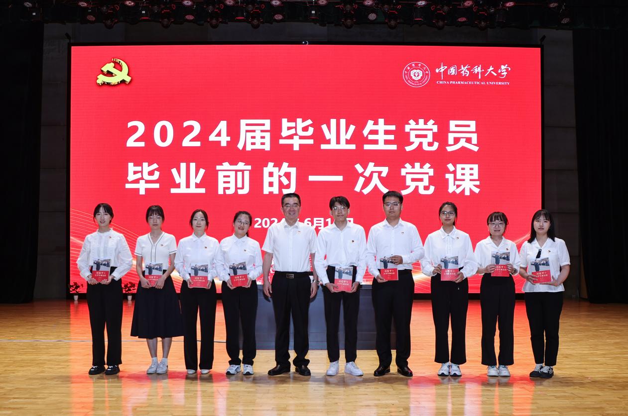 2023届中药学专业本科毕业生崔梦袁同学作为往届毕业生党员代表,2024届药学专业本科毕业生孙苏丹作为应届毕业生党员代表分别发言。党课结束后,校党委书记金能明向9位即将奔赴祖国西部和基层就业的毕业生党员代表赠送书籍《习近平与大学生朋友们》第二卷。活动最后,由2024届临床药学专业硕士研究生侯梦军领誓,2024届中药学博士毕业生高涵监誓,全体与会毕业生党员重温了入党誓词。