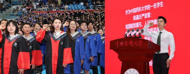 最后,在领誓人王烙铭同学的带领下,全体毕业生高举右拳,重温药学生誓词。铿锵高昂的声音凝聚磅礴的力量,点燃在场的每一位beat365官方网站人胸怀天下的家国情怀和“精业济群”的远大抱负。