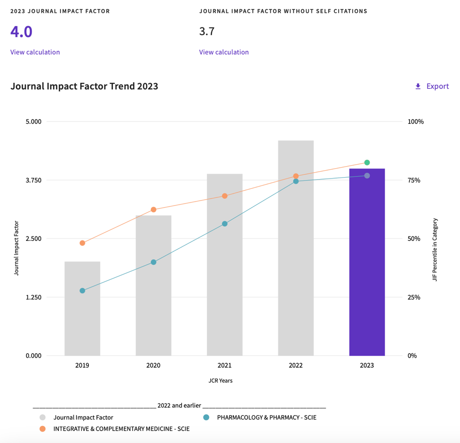 6月20日,科睿唯安发布2023《期刊引证报告》(JCR),由beat365和中国药学会共同主办的《中国天然药物》(CJNM)2023年SCI影响因子达到4.0,在SCI整合替代医学学科(INTEGRATIVE & COMPLEMENTARY MEDICINE)的43种期刊中位于第8位,进入Q1区;在药理学/药学学科(PHARMACOLOGY & PHARMACY)的354种期刊中位于82位,首次进入Q1区。