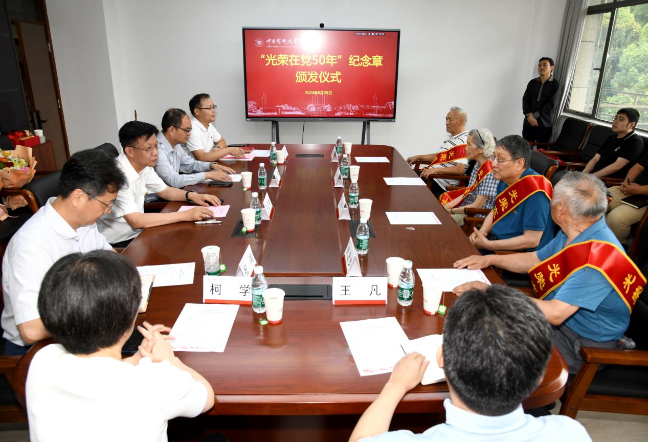 6月28日,学校党委在玄武门校区举行“光荣在党50年”纪念章颁发仪式。校党委副书记、副校长王正华出席并讲话,“光荣在党50年”纪念章获得者王明江、刘文英、黄启实、张进步及相关部门负责同志、青年师生党员代表参加仪式。