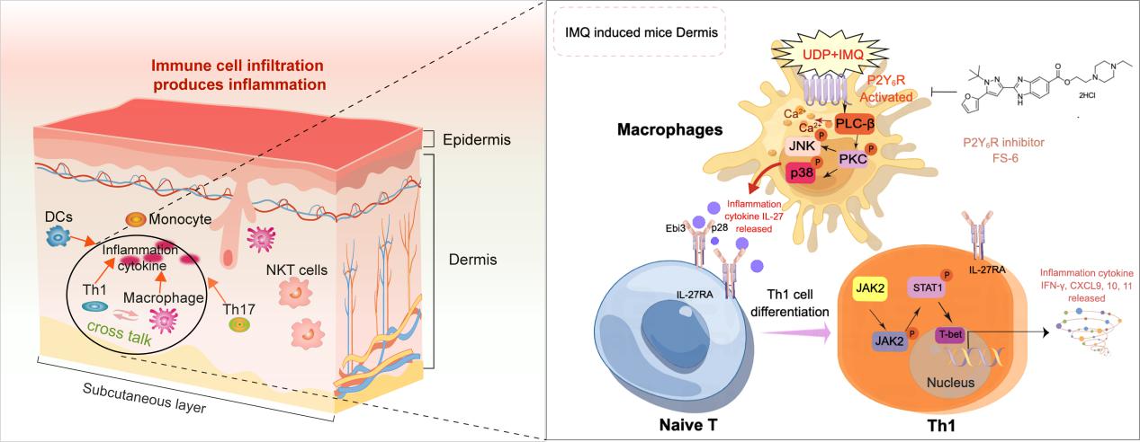 本研究揭示了嘌呤受体P2Y6R在银屑病发生发展中的关键作用。通过研究P2Y6R在银屑病患者和银屑病小鼠模型中的表达和定位,发现巨噬细胞中的P2Y6R对疾病具有正向调节作用。具体机制方面,巨噬细胞在P2Y6R激活的条件下,通过PLCβ/p-PKC/MAPK信号通路释放IL-27,导致Th1细胞分化的增加进而促进银屑病的发生。与此同时,课题组在前期研究基础上通过结构改造得到的新型P2Y6R抑制剂FS-6可显著改善银屑病的症状,为临床治疗提供了新的治疗手段。综上,该研究揭示了UDP-P2Y6R轴介导免疫细胞间通讯在银屑病发病过程中的作用,为银屑病的治疗提供了潜在新靶点。