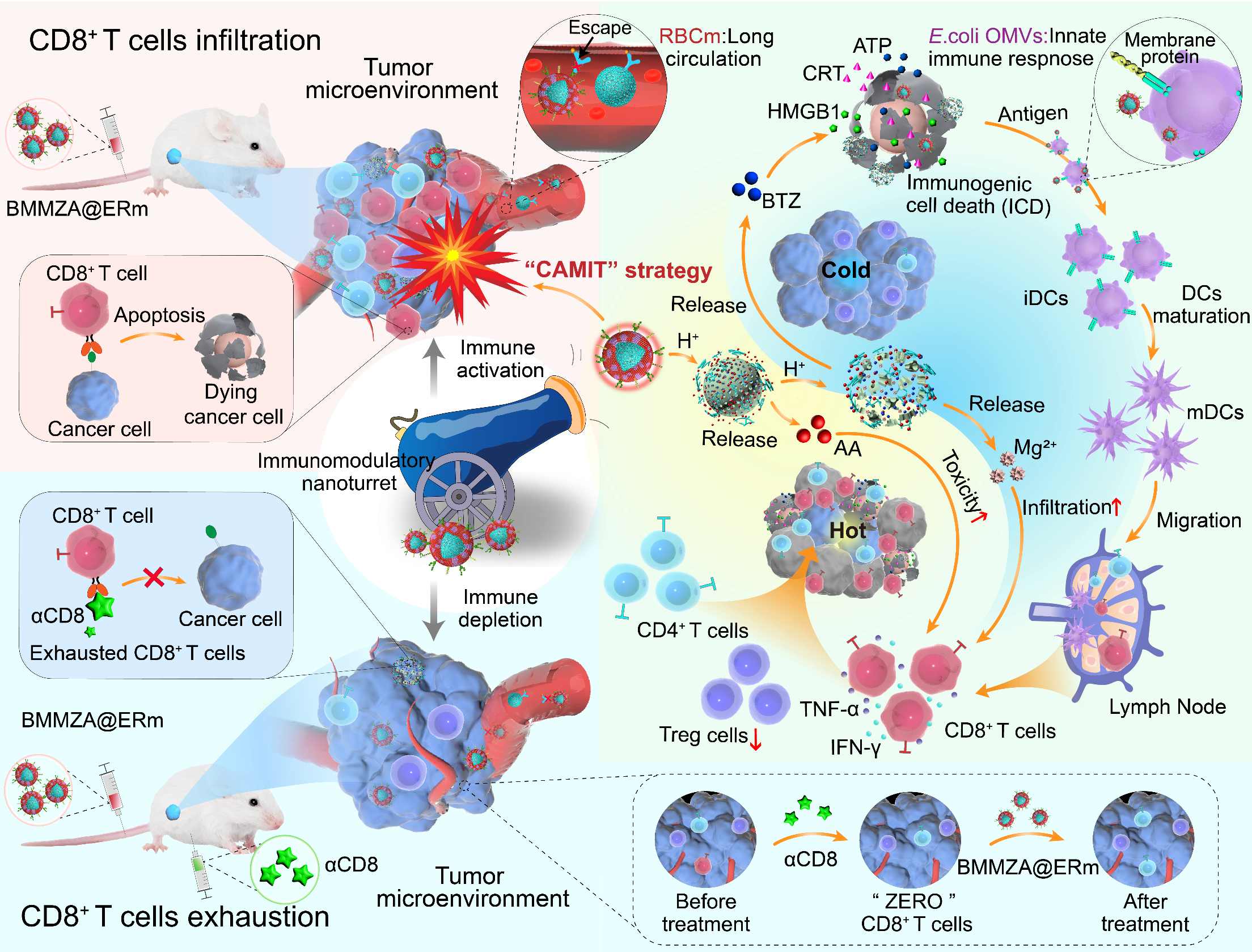 因此,范文培教授团队等以化疗诱导的免疫原性细胞死亡(ICD)作为引子,辅以一系列连锁免疫反应“点燃”免疫“冷”肿瘤,进而增强AA介导的免疫疗法。本研究精心构建了一种生物可降解的仿生纳米炮塔BMMZA@ERm,用于化疗辅助抗坏血酸介导的免疫疗法(CAMIT)。简而言之,ICD诱导剂硼替佐米(BTZ)首先被载入镁掺杂介孔二氧化硅纳米粒的孔道中(BTZ@MMS,BMM);然后利用载有AA的沸石咪唑框架-8(ZIF-8)包覆BMM,得到BMM@ZIF-AA(BMMZA);最后采用红细胞与大肠杆菌(E. coli)外膜囊泡(OMV)的杂交膜ERm对BMMZA表面进行伪装修饰(BMMZA@ERm),旨在延长其血液循环时间并且重编程肿瘤免疫微环境。BMMZA@ERm到达酸性肿瘤微环境后,其ZIF-8外壳和MMS内核会逐步降解,实现AA和BTZ的肿瘤选择性序贯释放。在肿瘤内部,BTZ可以产生强大的ICD效应,进而促进抗原呈递与适应性免疫反应激活。此外,包覆的OMV以及释放的Mg2+能进一步增加T细胞的激活与浸润,从而大幅增强ICD相关的免疫原性,将免疫学上的“冷”肿瘤转变为“热”肿瘤。肿瘤微环境中被唤醒的T淋巴细胞大军就像一颗炮弹,最终被AA点燃,表现出强大的细胞毒性,从而显著抑制肿瘤的生长与转移(如图)。本研究为高效激活T细胞、逆转免疫抑制的肿瘤微环境、增强AA介导的免疫协同疗法提供了新思路和新方法。