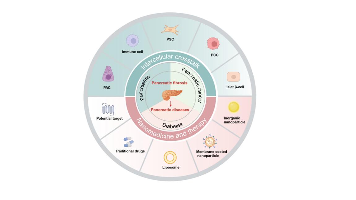 不同疾病背景下,纤维化病理微环境中与PSC相互作用的细胞机制不同。基于前期的工作基础,本团队系统总结纤维化在三种常见胰腺内外分泌疾病(包括胰腺炎、胰腺癌和糖尿病)进展中的作用,并分析了不同疾病的纤维化微环境中错综复杂的细胞间互作机制,探讨了纳米药物在纤维化及胰腺疾病中的潜在靶点及治疗策略,为深入了解胰腺疾病中PSC介导的细胞间互作机制及基于纳米药物的精准治疗提供有价值的见解,以“Nanomedicine regulating PSC-mediated intercellular crosstalk: mechanisms and therapeutic strategies”为题发表在Acta Pharmaceutica Sinica B上,论文共同第一作者为东南大学医学院王慧博士生、祁靓博士和beat365官方网站药学院韩涵博士后,东南大学附属中大医院李玲教授和beat365官方网站药学院姜虎林教授为本文共同通讯作者。