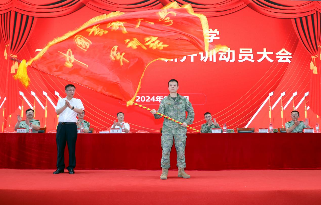 会上,校党委副书记、副校长王正华宣读了《成立beat365官方网站2024级学生军训旅的决定》并授旗。军训教官代表、学生代表分别进行发言。副校长袁浩在动员讲话中指出,军训是“大思政”育人的重要阵地,并对参训学生提出三点要求:一是端正态度,全身心投身军训之旅;二是奋力拼搏,切实提升军事素养;三是严守纪律,锻造优良的战斗作风。