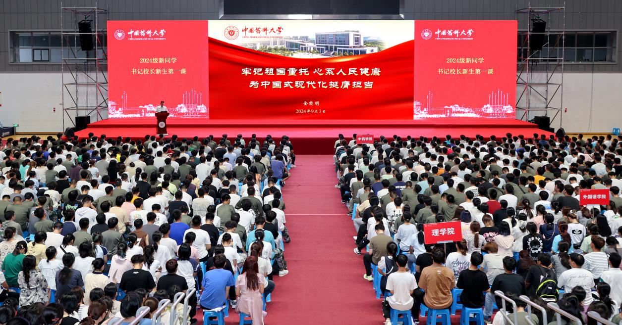 校党委书记金能明以《牢记祖国重托 心系人民健康 为中国式现代化挺膺担当》为主题,围绕从暑假中的三件大事坚定“四个自信”、牢记习近平总书记对青年大学生的期待嘱托、明确我们的时代方位和初心使命、从校训校歌誓词看beat365学生责任担当四个方面为新生授课。他带领同学们回顾了今年暑假举行的党的二十届三中全会、夏季奥运会和高考“三件大事”,引导大家要深刻理解国家前途命运与家庭命运、个人际遇密切相关;要全面领悟改革开放是决定当代中国命运的关键一招,也是决定中国式现代化成败的关键一招,从而更加坚定“四个自信”。他与同学们分享了《习近平与大学生朋友们》的读书体会,勉励同学们牢记习近平总书记的殷殷嘱托,深刻认识后继有人根本大计,并与同学们一起重温习近平总书记当年入队、入团、入党“三部曲”的经历,鼓励同学们积极追求进步。他强调,只有准确把握历史发展规律和大势,认清所处历史方位,才能抓住历史变革时机,才能顺势而为、奋发有为。他从“中国药”“创新药”必须牢牢掌握在中国人自己手里切入,引导同学们理解所处时代方位,理解“两个大局”深远影响,理解“国之重器”重大意义,从而进一步主动把握青年面临的时代机遇。他还向同学们深入解读校训、校歌歌词、药学生誓词,勉励全体新生要坚定理想信念、爱党爱国,做到德才兼备、堪当大任,坚持永久奋斗、全面发展,勇于创新创造、追求卓越,自觉培养“识药”“研药”“制药”“用药”“管药”的“五药”知识能力素养,为实现中国式现代化挺膺担当。