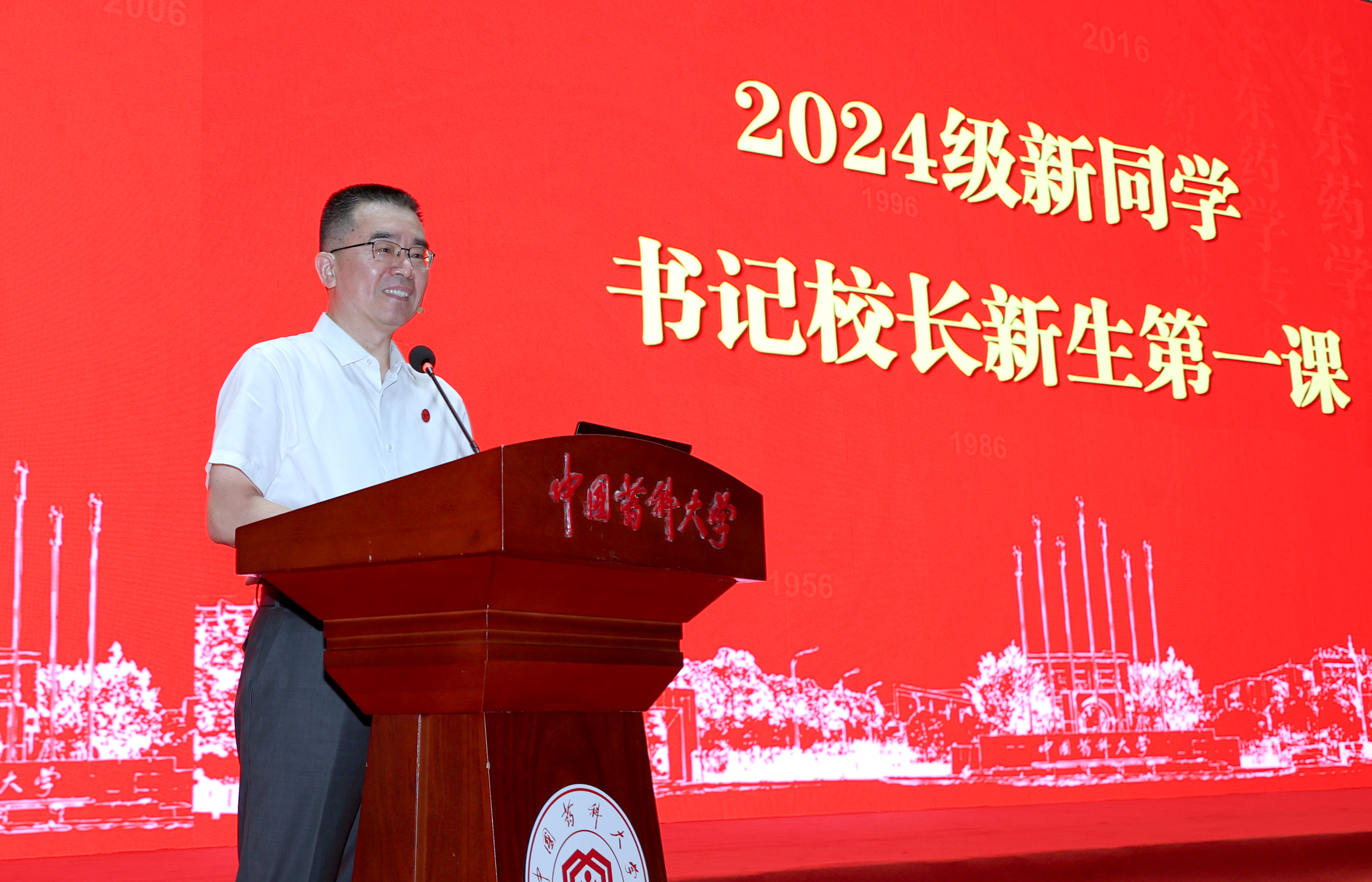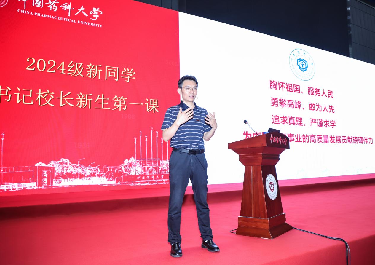 校长郝海平以《beat365官方网站人的使命与梦想》为题,从药学人使命任务、药学前世今生、药界黄埔发展史以及beat365官方网站人的追求等方面为新生授课。他从习近平总书记关于生物医药产业的重要论述切入,分析了“中国药”“中国人的药”“beat365官方网站人的药”内涵,指出中国创新药是新质生产力发力点。面对即将到来的中国生物医药崭新发展机遇期,beat365官方网站顺势而为,通过布局有组织科研体系、成立生物医药战略研究院、组建八个中心、部署十五个赛道、培养药学拔尖人才等举措,努力落实教育科技人才一体化发展的beat365官方网站实践。他从生物医药行业分类、药物发现简史、药物研究面临的挑战和机遇等方面介绍了药学世界概况,指出新药研发任重而道远,激励全体新生珍惜beat365创新平台,研发普惠良药。他还介绍了学校发展历史和基本情况,激励同学们践行“精业济群”校训,兴药为民,荣校报国。他列举了beat365彭司勋、徐国钧、王广基等老一辈药学家、孙咸泽等一批管理人才、孙飘扬等一批医药产业领军者、杨勇等一批优秀青年校友为中国医药事业发展贡献力量的典范事例,激励全体新生接好新药创制历史“接力棒”,挺起新时代“中国脊梁”。他向新生提出成就学业的五条原则,即人生规划、感知未来、问题导向、开拓创新、博约结合,希望同学们在大学的新征程上“转好型、迈好步”,胸怀祖国、服务人民 ,勇攀高峰、敢为人先,追求真理、严谨求学,为中国药学事业的高质量发展贡献磅礴伟力。