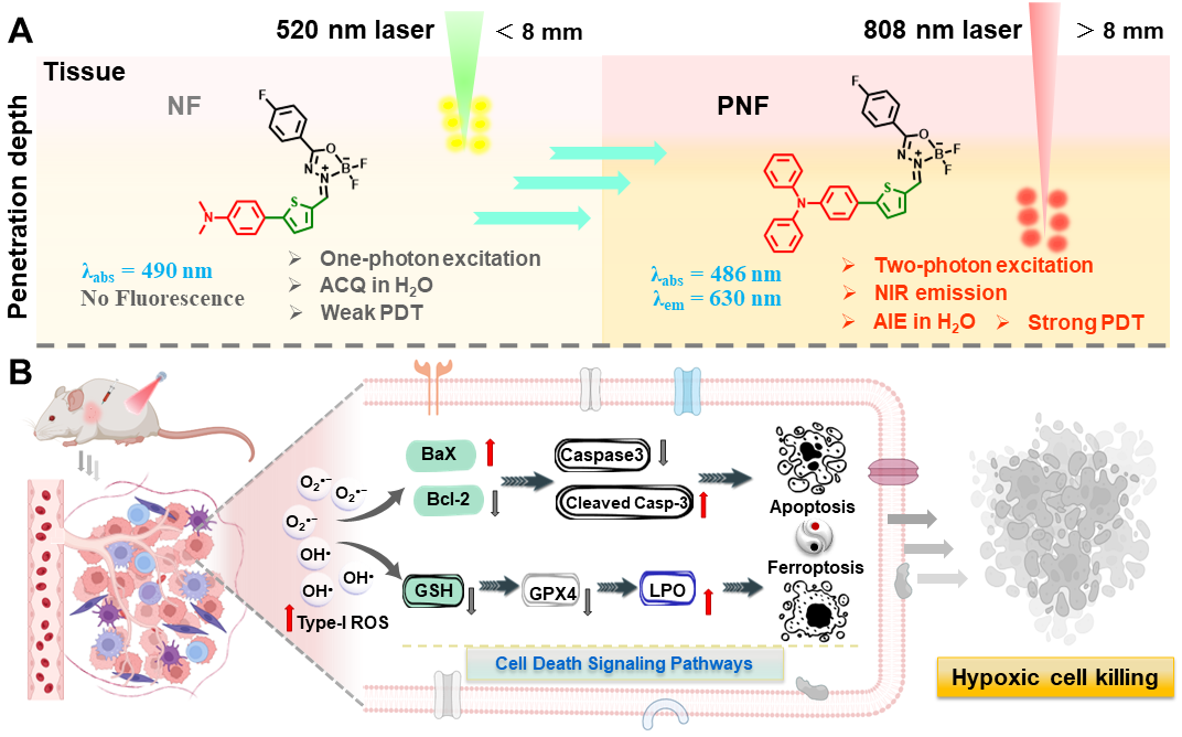 近日,工学院袁振伟副教授团队联合香港中文大学唐本忠院士、北京工业大学宋峰岩博士,共同设计开发了一种双光子激发的无重原子光敏剂PNF 。PNF可作为 I 型光敏剂来克服 PDT 在治疗缺氧肿瘤方面的局限性并具有深层组织穿透能力。光敏剂 PNF 表现出独特的聚集诱导发射特性,在 808 nm 激光照射下可通过 I 型光化学过程产生 O2 • −和 OH•。PNF 诱导的双光子激活 PDT 破坏了细胞氧化还原稳态,并增加了脂质过氧化水平,导致细胞凋亡以及铁死亡。体外和体内实验证明了这种协同治疗策略在抑制缺氧癌细胞和肿瘤生长方面的有效性。相关研究成果发表于Advanced Functional Materials ( IF = 18.5 )上。工学院博士研究生刘季为论文第一作者,袁振伟副教授为论文通讯作者,beat365官方网站为第一通讯单位。