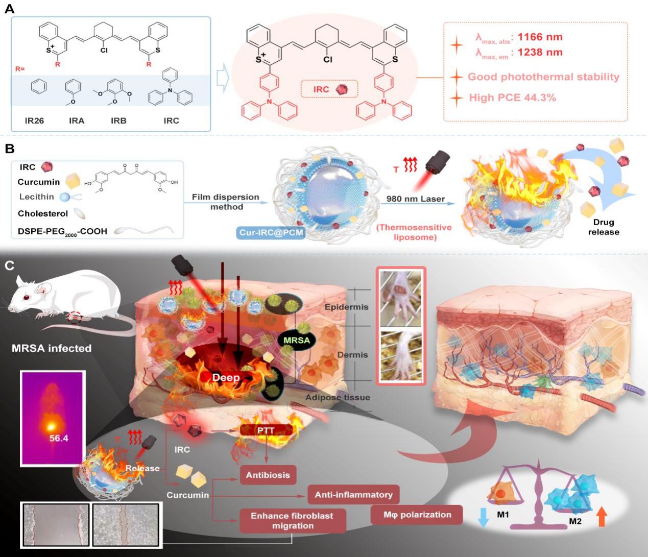 同期,袁振伟副教授团队联合厦门大学郑锦荣研究员,通过对近红外二区光热剂IR 26进行结构修饰,合成了具有D-A-D结构的新型近红外二区染料(IRC),并提高其光学性能。在IRC的特殊光热特性的基础上,加入了姜黄素,一种天然的伤口愈合化合物,以解决细菌感染和破坏糖尿病伤口中的巨噬细胞分化。最后利用相变材料(PCM)脂质体进行包封。在使用980 nm激光作用下,Cur-IRC@PCM NPs通过IRC诱导光热效应,允许PCM脂质体达到其相变温度并随后释放负载的药物(姜黄素),协同PTT产生抗菌效果。它还促进伤口愈合。该策略通过实现PTT联合抗菌药物杀灭细菌的序贯治疗效果,随后程序化诱导M2极化,成功治疗了MRSA感染的糖尿病伤口。该研究以题为“Development of D–A–D-Type NIR-II Photothermal Agents for Synergistic Eradication of Multidrug-Resistant Bacteria and Promoting Diabetic Wound Healing”发表在工科顶尖期刊Advanced Functional Materials上。工学院博士研究生刘季为论文第一作者,袁振伟副教授为论文通讯作者,beat365官方网站为第一通讯单位。