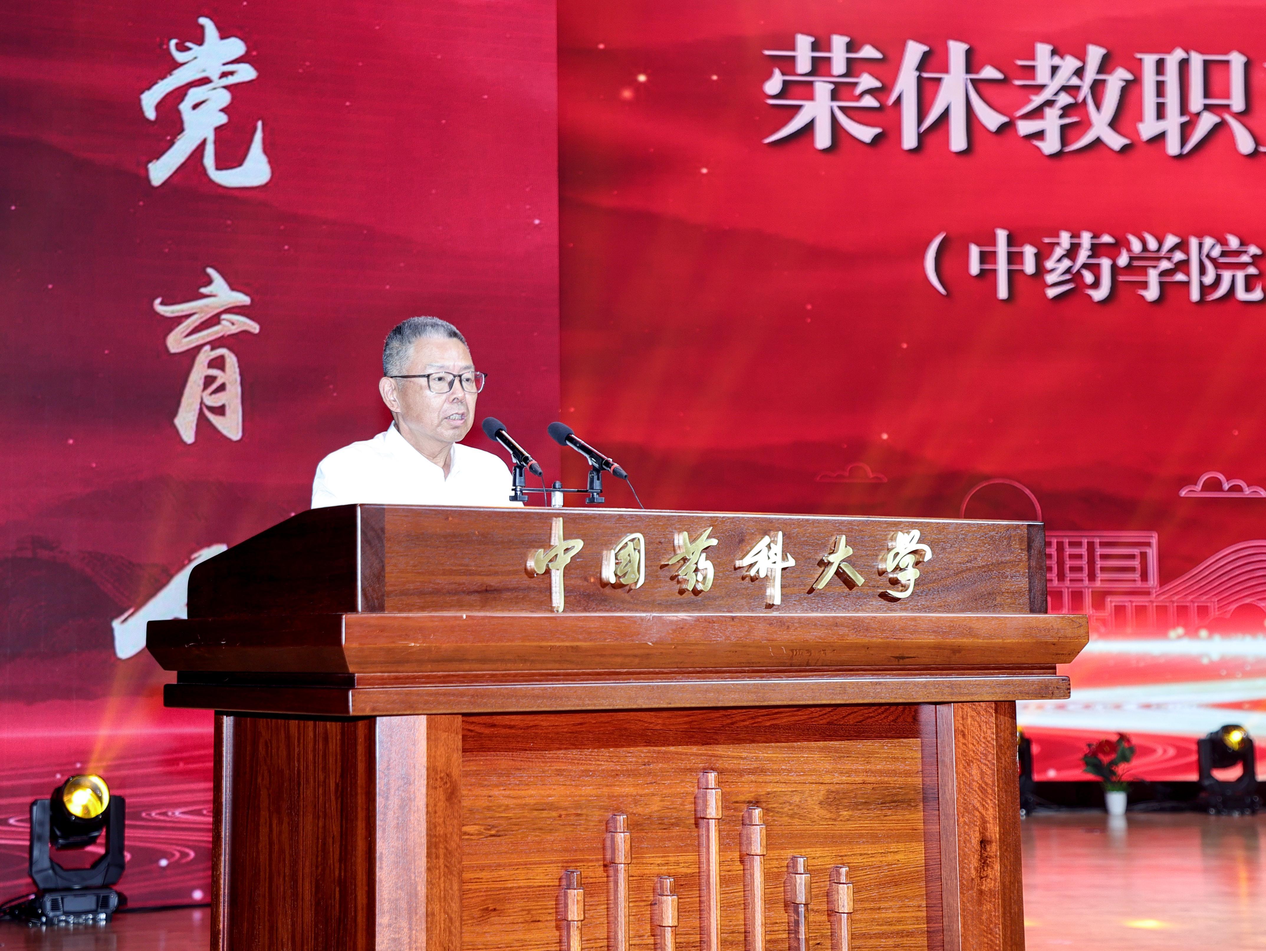 大会共分三个部分。在第一篇章“忆往昔”环节中,校党委书记金能明、校长郝海平分别为2023年10月至2024年9月荣休教职工代表和从事教育工作满30年教职工颁发纪念章。中药学院余伯阳教授作为荣休教师代表发言,他深情回顾了自己受老一辈教师的教诲,从教四十年来一直传承和发扬尊重师长、团结协作的优良传统,并表示愿为进一步推动学校高质量发展继续发挥余热。