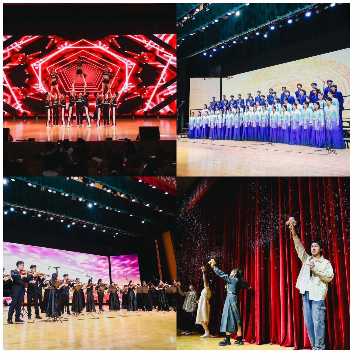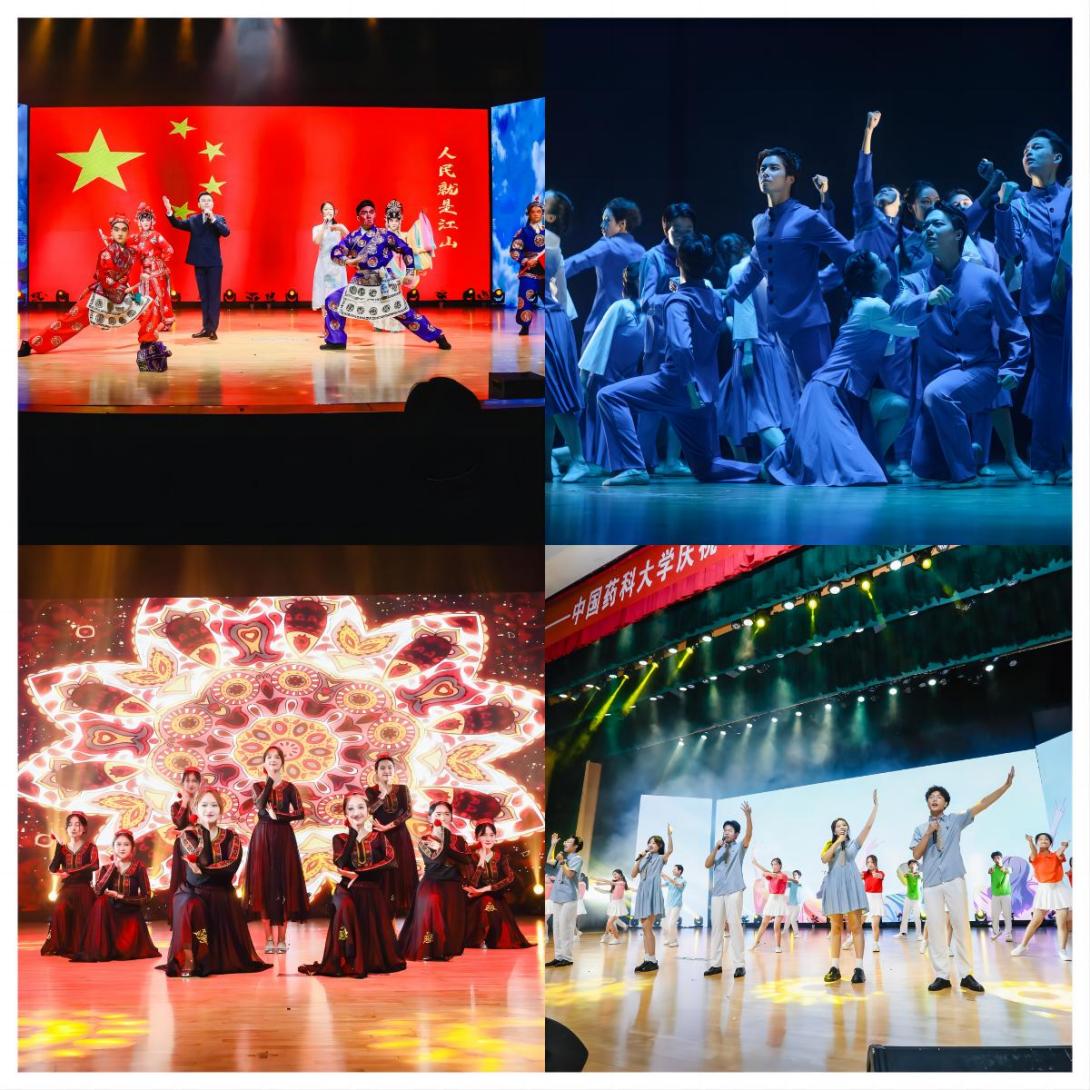 晚会在激情四溢的歌伴舞《新青年》中拉开帷幕,青春的歌声和舞蹈将现场观众带回到那个热血沸腾、激情燃烧的岁月。江苏省朗诵家协会的刘书浩、张誉允老师携手文鸿朗诵团为大家带来一首深情款款的诗朗诵《书写青春华章》。红叶舞蹈团的《能不忆江南》、少数民族预科班的《民族团结花盛开》舞蹈,校健美操队的啦啦操表演《我和我的祖国》以及歌曲《光亮》,无不向大家呈现了中华民族团结的美好图景和各民族人民的幸福生活。在第二篇章中,校团委刘超老师和特邀嘉宾江苏省演艺集团张馨月老师联袂带来京剧戏歌《中华》,京剧的韵味与现代音乐的节奏相互交织,让人感受到中华文化的博大精深与时代变迁的无限可能。此外,2024级新生辅导员与新生代表们深情朗诵原创诗歌《以薪火弦歌,铸药世风华》,让人感受到新一代青年的责任担当以及对药学事业的热爱追求。交响乐团新生代表们则以小提琴齐奏《山丹丹开花红艳艳》,表达了当代青年学子对党的真挚情感。在第三篇章中,校团委艺术中心李众川老师和学生代表共同演唱的歌曲《我爱你中国》、凌霄合唱团带来的《神农》和《祖国不会忘记》,更是表达了深深的爱国爱校情怀。往届十佳歌手们用充满了活力与激情的歌声带领大家许下对未来的美好的祝愿与期待。