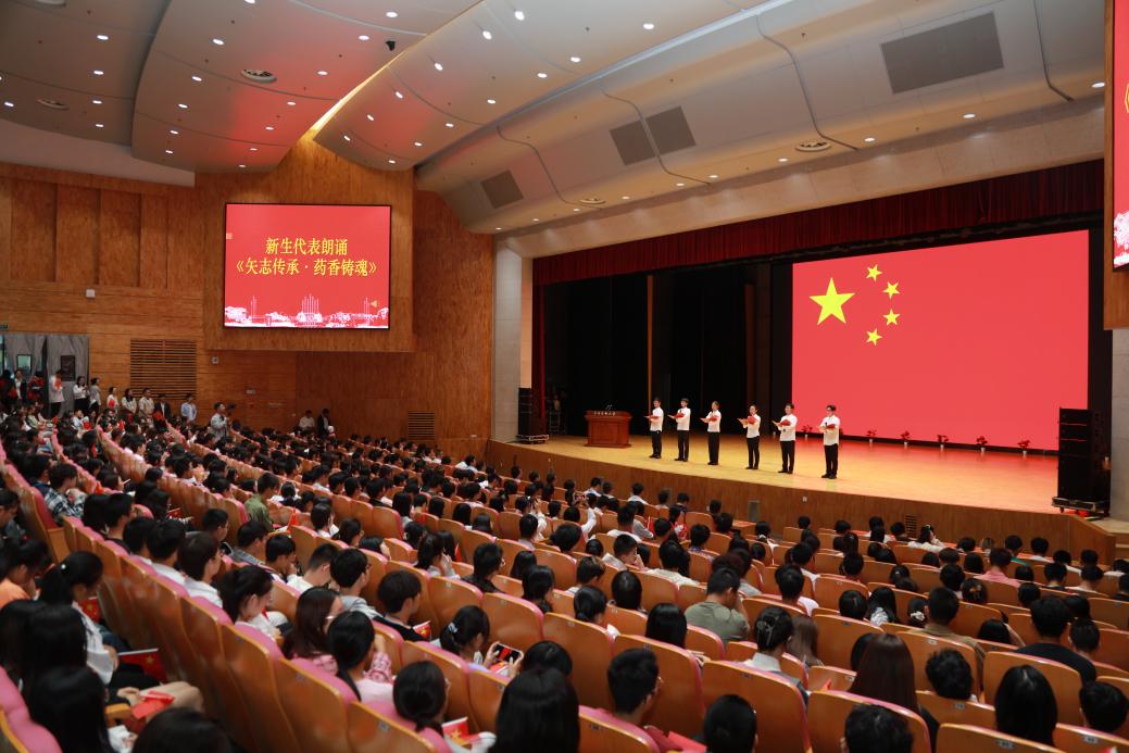 其间,本科新生代表深情朗诵师生原创诗歌《矢志传承·药香铸魂》,赞颂了新中国成立75周年来的历史性成就,表达了beat365官方网站青年践行“精业济群”校训精神、献身医药事业的决心与毅力。