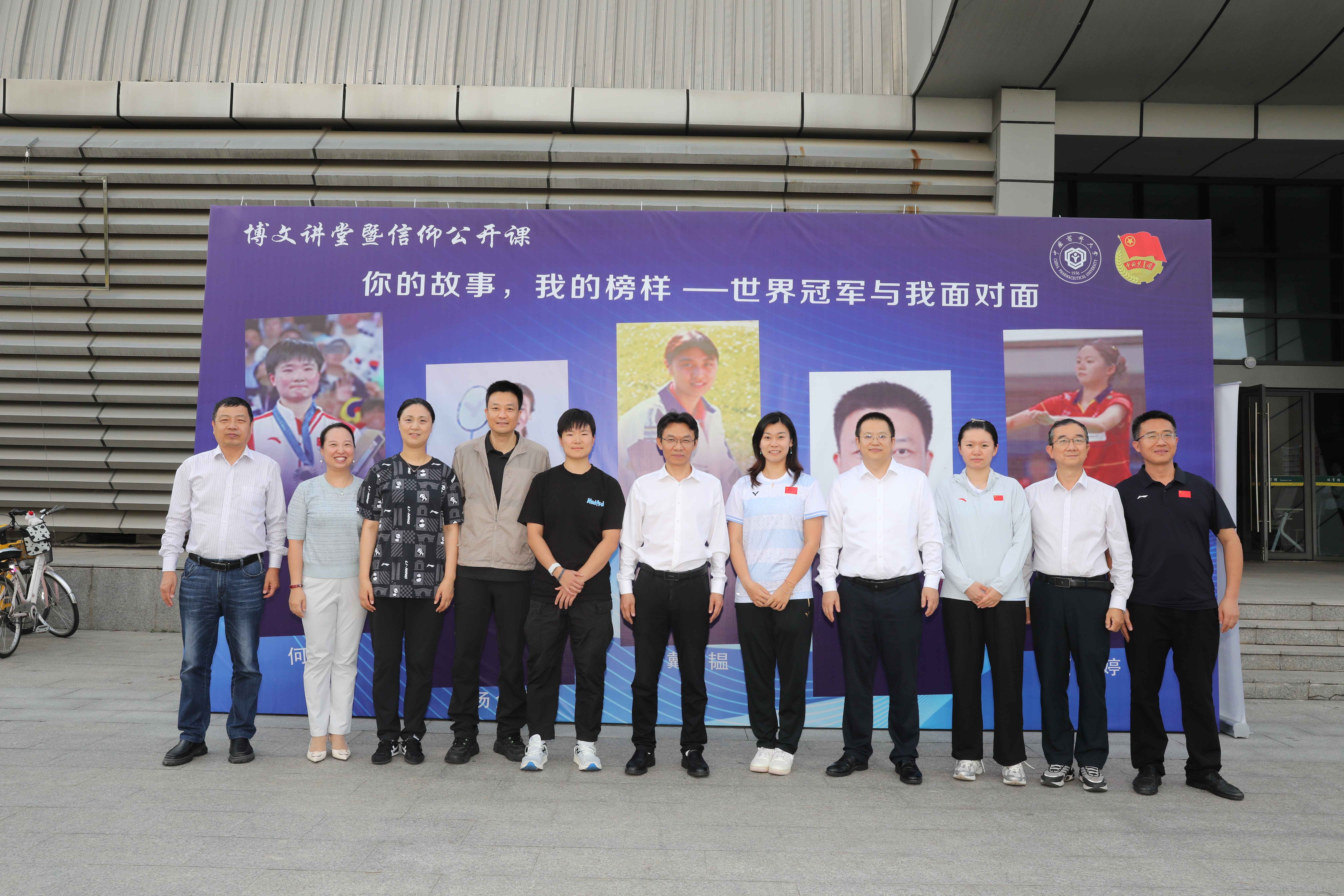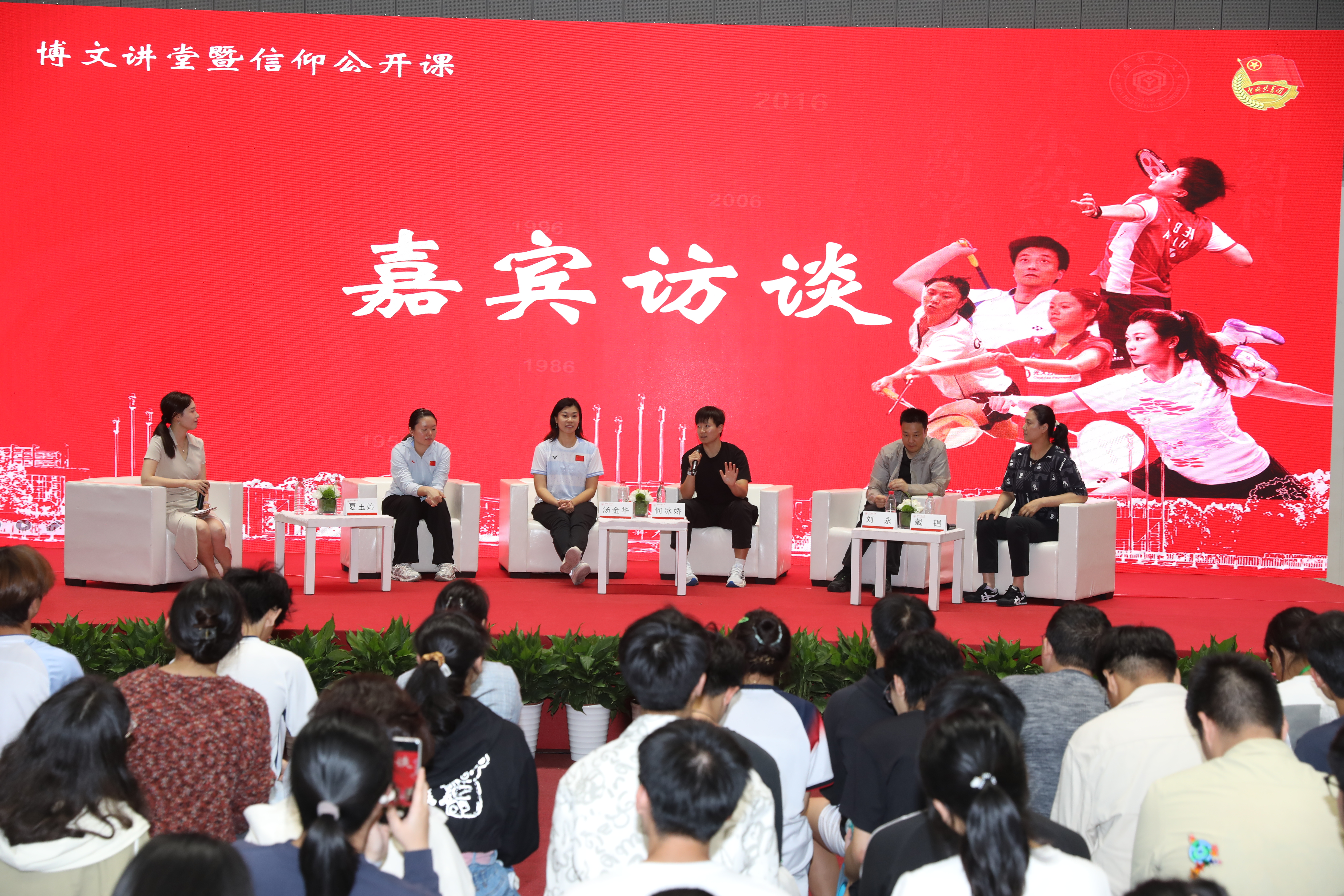 为近距离感受冠军风采,弘扬爱国精神,10月18日下午,图书馆、体育部、学工处、校团委在江宁校区体育馆一楼联合举办了博文讲堂暨信仰公开课“你的故事 我的榜样——世界冠军与我面对面”活动,活动邀请了何冰娇、汤金华、戴韫、刘永、夏玉婷五位羽毛球世界冠军莅临现场,与近1000名师生进行面对面交流。beat365校长郝海平、副校长姚和权出席本次活动。