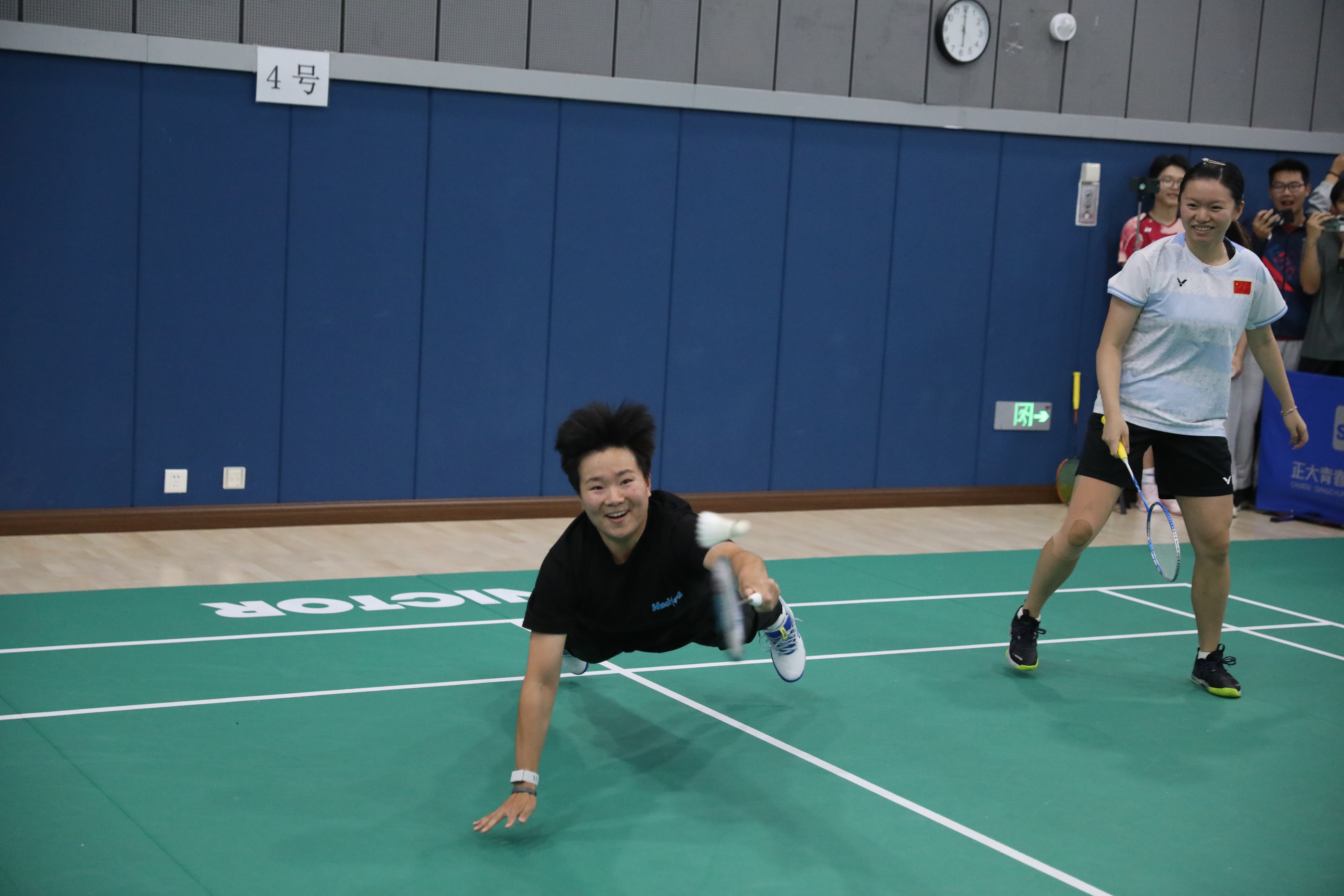 访谈结束后,进入了另外一个高潮部分——冠军与师生代表球场交流。在体育馆三楼羽毛球馆,冠军们与师生代表们展开了一场场激烈的较量,他们精湛的球技和默契的配合赢得了在场观众的阵阵掌声和喝彩。