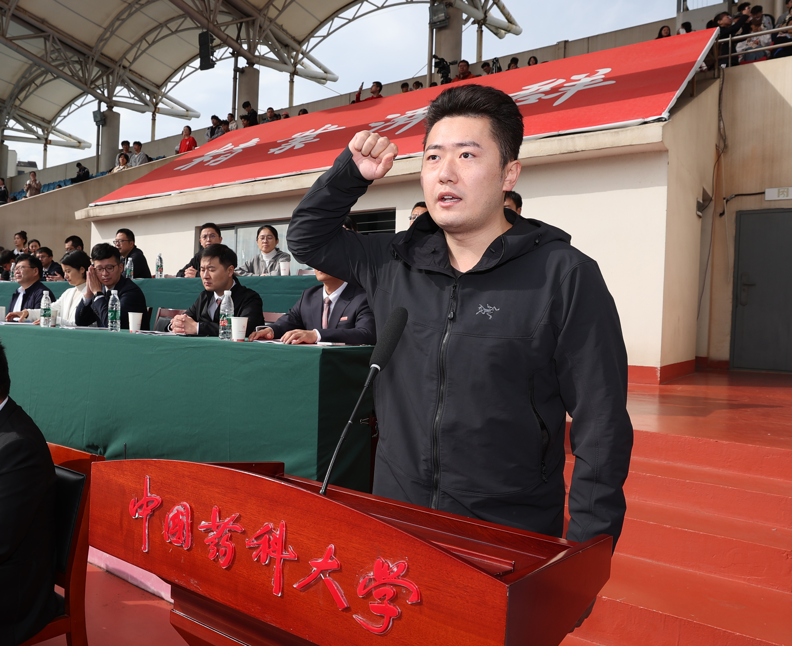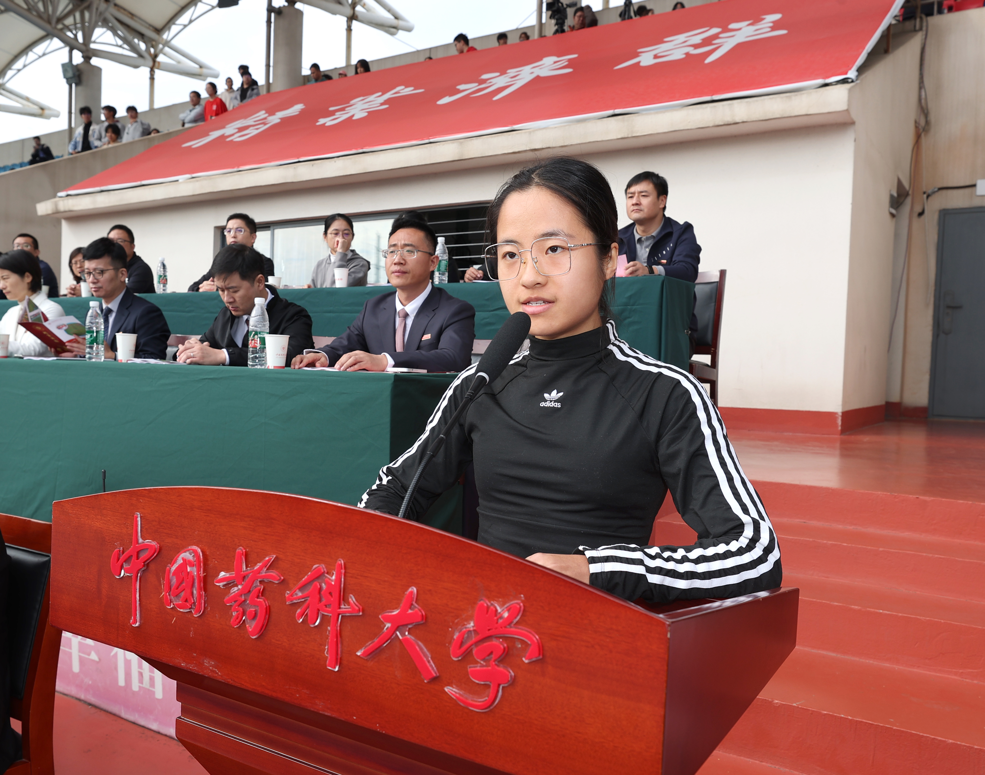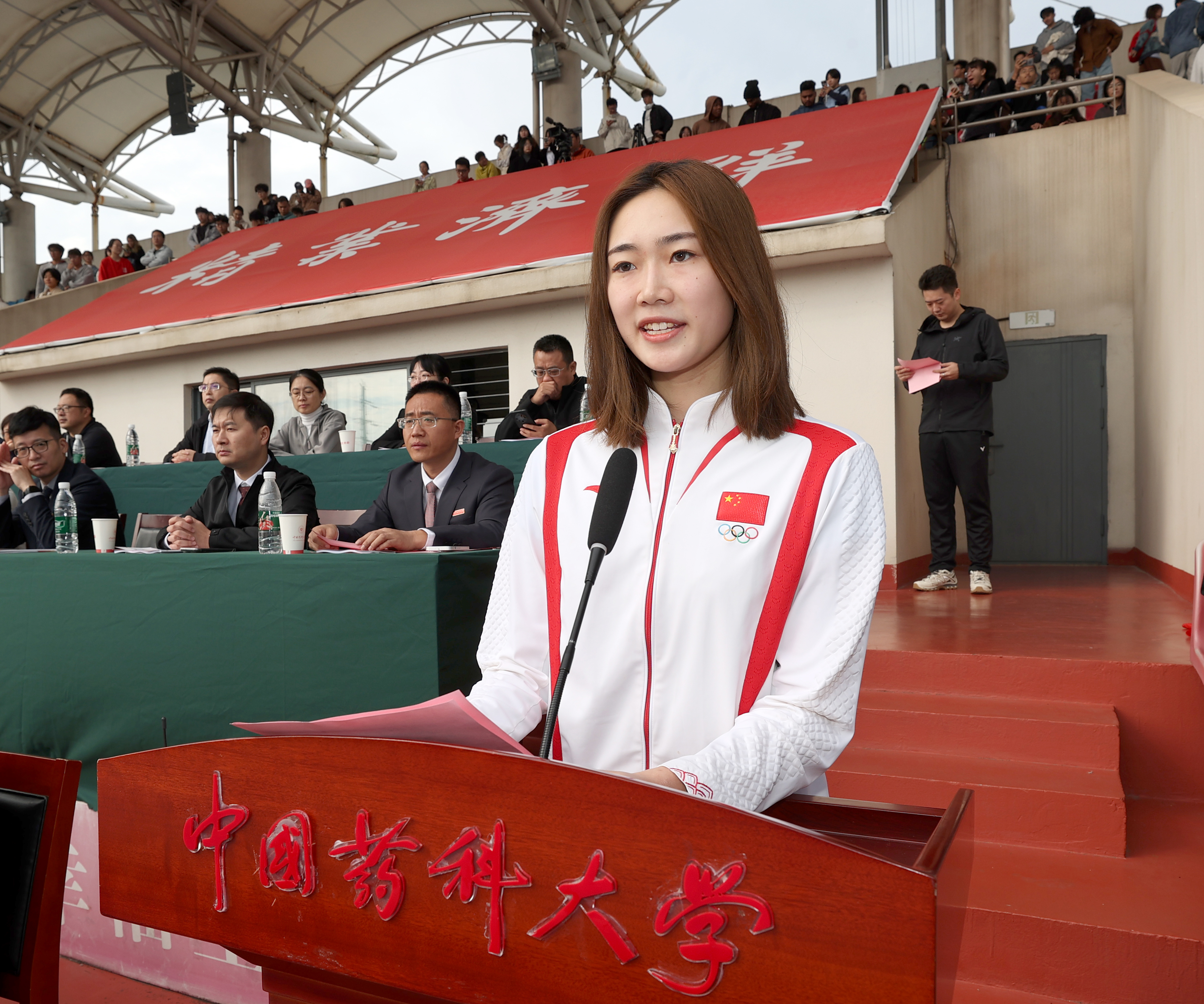 随后,裁判员代表、体育部金逸伦老师和运动员代表、药学院谢海忻同学进行了庄严宣誓。
