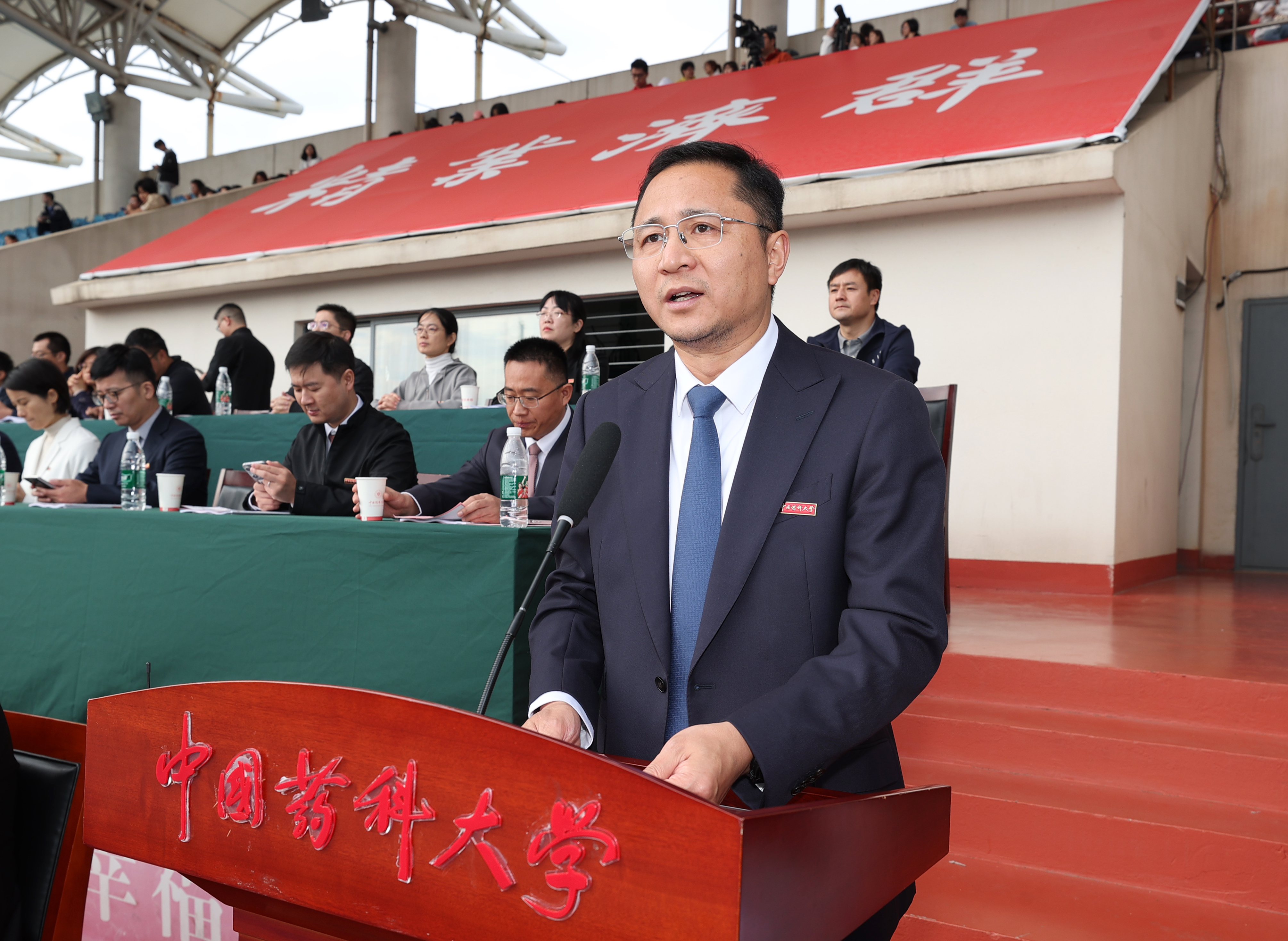 副校长杨勇代表学校向本届田径运动会的成功举办表示热烈祝贺,向辛勤筹备运动会的师生表示衷心感谢,并向全体裁判员和运动员致以亲切的问候和美好的祝愿。他指出,学校高度重视体育教育的发展,持续深化教育教学改革,不断完善体育设施,取得了一系列成绩,并预祝本届运动会取得圆满成功。