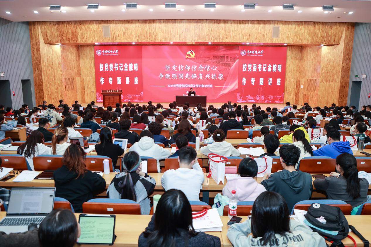 开班式后,校党委书记金能明作了题为《坚定信仰信念信心 争做强国先锋复兴栋梁》的专题讲座。金书记从深刻认识“两个大局”讲起,系统讲解了党高度重视教育事业发展的深刻内涵、分析了我们青年面临的时代机遇,帮助同学们认识大局形势增强“四个自信”。他通过后继有人根本大计、习近平总书记对青年大学生的殷切期望、青年政治进步之“人生三部曲”系统阐释了持续抓好后继有人的根本大计。他强调同学们努力做到在思想上组织上“双入党”的重要性,要求党员发展对象重点加强党纪学习教育。最后金书记勉励同学们要始终牢记宣誓是一时之举,践行誓言是一辈子的事;要始终牢记党的初心使命,要成为青年党员矢志不移的追求;要始终牢记党的伟大事业需要一代代青年的赤胆忠心和牺牲奉献;要始终牢记时代呼唤担当,强国建设民族复兴是当代青年的历史责任。金书记用生动的故事、鲜活的案例、真挚的情感,讲初心使命、讲红色故事、讲榜样精神,有党味、有温度、有深度、有情怀,深入浅出地讲授了一堂生动精彩的党课。
