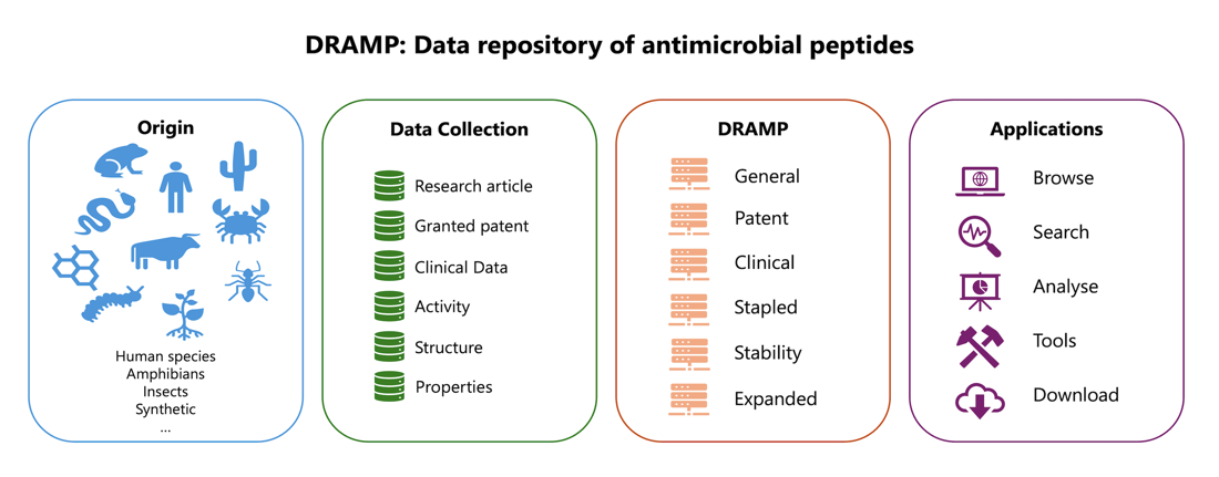 细菌耐药性是当前全球公共卫生领域面临的重要问题之一。抗菌肽具有广谱抗菌活性,作用机制独特,较难诱导耐药,在耐药细菌感染临床上具有重要应用前景,但受限于稳定性、溶血性以及细胞毒性等性质,目前进入临床研究的抗菌肽仍较少。DRAMP(Data repository of antimicrobial peptides, http://dramp.cpu-bioinfor.org/)第4版更新侧重于抗菌肽的临床转化,首次添加了抗菌肽血清/蛋白酶半衰期稳定性数据,并补充了大量实验测定的抗菌肽溶血/细胞毒性数据。除此以外,本次更新新增了8000多条抗菌肽条目,包括来自中文文献的抗菌肽信息。这些信息和数据可以免费从数据库的download界面下载,可用于促进人工智能辅助的抗菌药物设计。