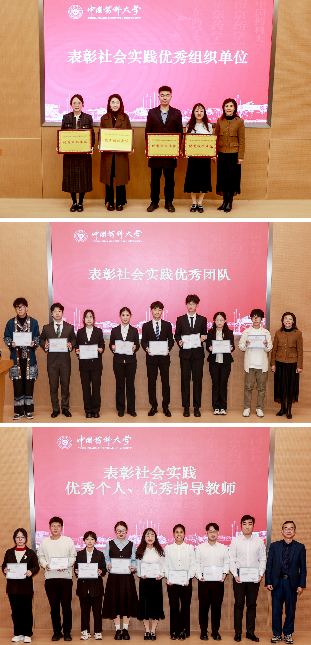 会议伊始,6个优秀社会实践团队代表分别从活动组织开展、具体推进实施、实践成果成效等方面进行现场展示。各团队实践内容丰富、形式新颖、成效显著,不仅受到了当地的热烈欢迎和高度评价,也充分展示了beat365官方网站学子的良好形象和青春风采。多靶标天然药物全国重点实验室辛雯雯同学、国际医药商学院团委书记周玲、药学院党委副书记孟祥康等分别从实践个人、指导教师、组织单位等角度与现场师生分享了参与、指导和组织开展社会实践活动的思考与体会。会上,对2024年暑期“三下乡”社会实践活动中的优秀个人、优秀指导教师、优秀实践团队和优秀组织单位进行了表彰。