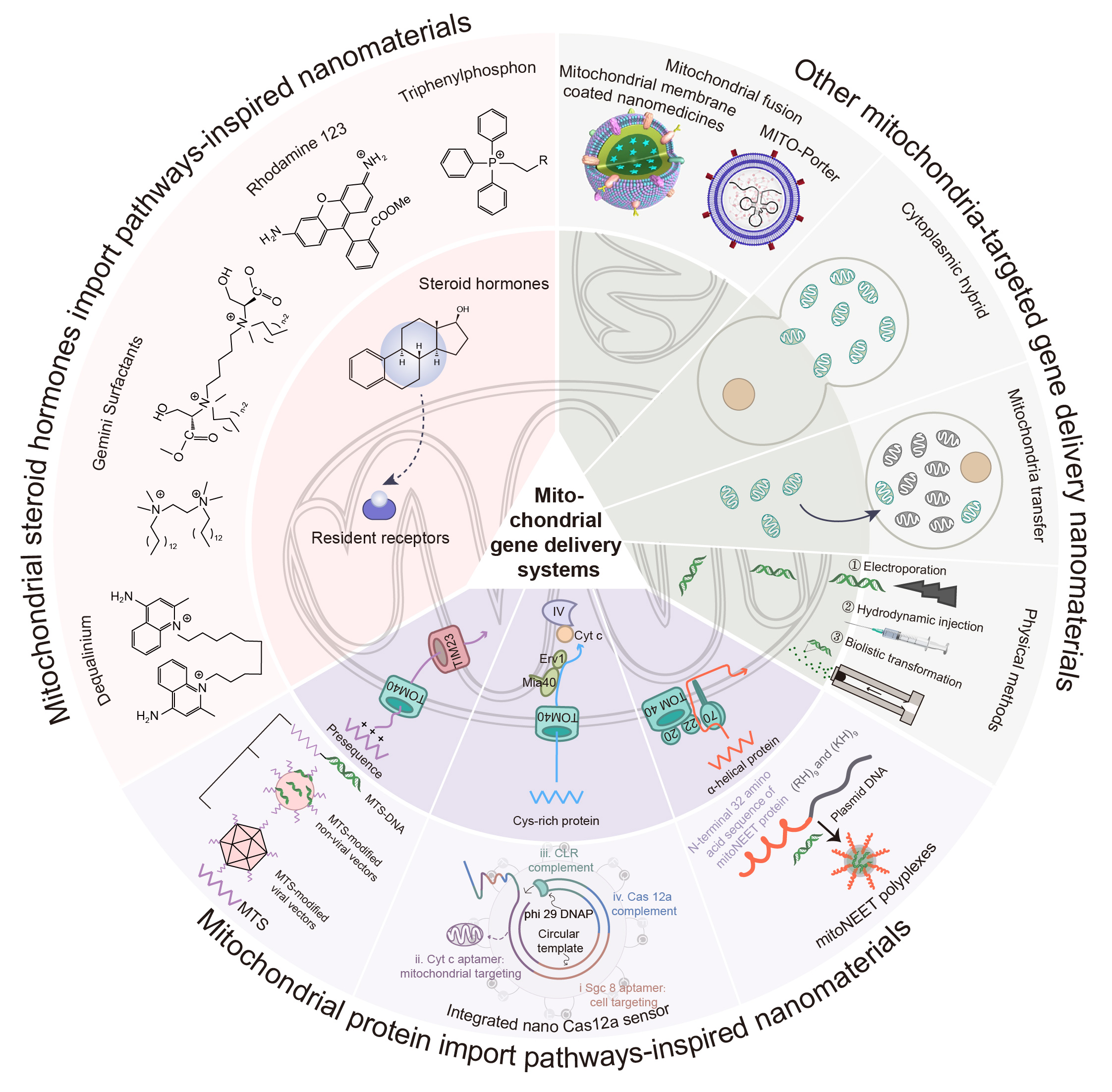 基于前期基础,该团队系统总结了受线粒体内源性物质运输途径启发的线粒体靶向基因递送系统,其中包括受线粒体类固醇激素导入途径启发的纳米材料、受蛋白质转运途径启发的纳米材料以及其他线粒体靶向基因递送纳米材料,并详细介绍了线粒体靶向递送系统的设计理念及其所面临的挑战。相关工作以“Mitochondrial endogenous substance transport-inspired nanomaterials for mitochondria-targeted gene delivery”为题发表在Advanced Drug Delivery Reviews上,药学院副研究员王译、硕士生杨景松、博士生赵敏为共同第一作者,姜虎林教授为本文唯一通讯作者。