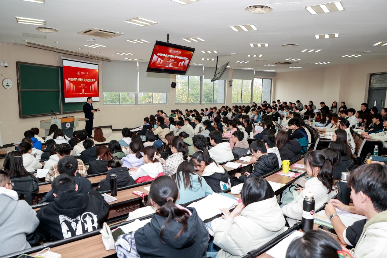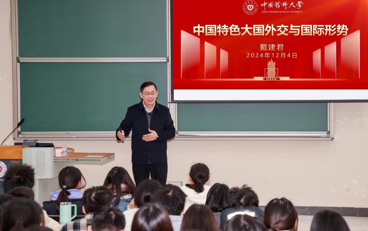 为进一步贯彻落实党的二十届三中全会精神和习近平总书记对学校思政课建设作出的重要指示精神,持续推动习近平新时代中国特色社会主义思想进教材进课堂进头脑,12月4日,校党委书记戴建君以“中国特色大国外交与国际形势”为主题,为药学院药学类大一新生讲授 《形势与政策》课。相关职能部门、马克思主义学院、药学院负责人,形势与政策课教师和辅导员代表旁听了授课。