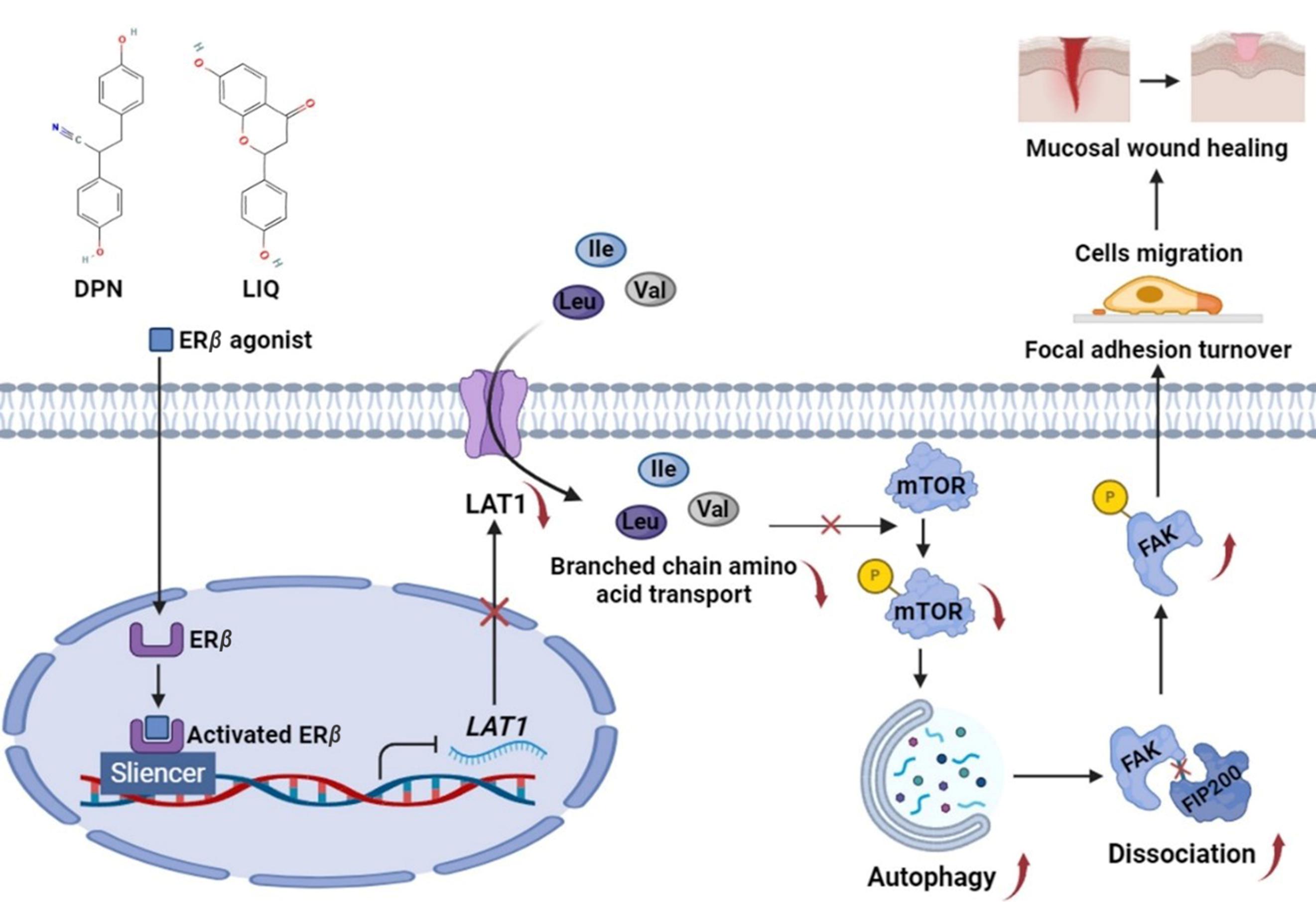 溃疡性结肠炎(UC)是一种慢性非特异性炎症性肠病(IBD),传统疗法主要依赖抗炎药物和免疫抑制剂,但大多疗效一般,难以阻止疾病的进展和复发。究其原因,可能是由于这些药物对黏膜创面无直接影响,肠道抗原持续入侵固有层,导致肠道炎症迁延不愈。而实现黏膜愈合的UC患者的并发症发生率、住院风险和手术干预率均显著降低,表明黏膜愈合是UC治疗的终极目标,黏膜愈合促进剂值得期待。临床资料显示,雌激素水平与UC疾病严重程度呈负相关,ERβ为肠道中雌激素受体的主要形式,其是否/如何促进黏膜愈合尚未见研究。
