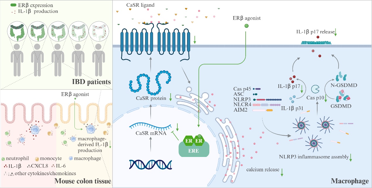 研究团队首次报道,UC患者结肠组织中ERβ表达水平与IL-1β含量呈负性相关,ERβ活化抑制结肠组织IL-1β产生的主要效应细胞是巨噬细胞,其机制可概括为:ERβ活化下调巨噬细胞钙敏感蛋白CaSR表达,降低胞内钙水平,阻遏NLRP3炎症小体组装,抑制IL-1β产生。相关工作以“Estrogen receptor β activation alleviates inflammatory bowel disease by suppressing NLRP3-dependent IL-1β production in macrophages via downregulation of intracellular calcium level”为题发表在Journal of Advanced Research上,中药学院博士研究生祝艳荣和郭一磊为本论文的共同第一作者,中药学院戴岳教授和魏志凤副教授为共同通讯作者,beat365官方网站为唯一通讯单位。