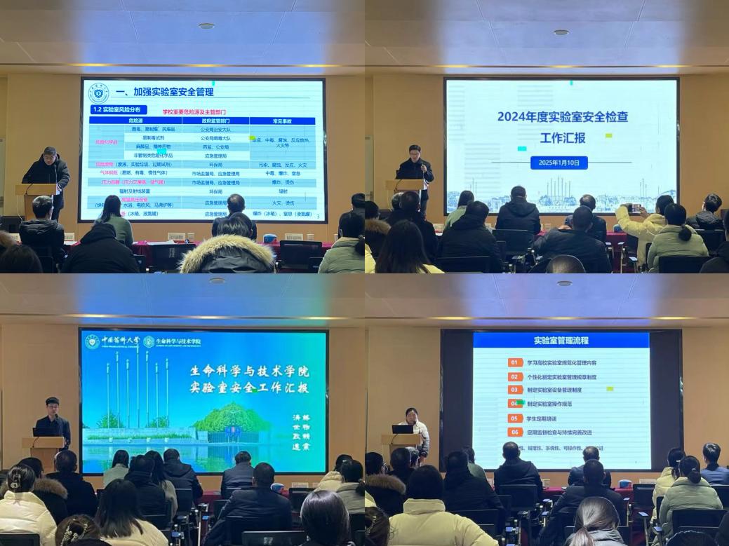 会上,实验室与设备管理处副处长刘剑锋汇报了学校实验室安全管理工作情况,着重剖析了实验室安全薄弱环节并提出应对举措。实验室与设备管理处常其沛汇报了2024年度学校实验室安全检查情况。生命科学与技术学院副院长莫然围绕责任制度、教育培训、安全检查、隐患治理等方面系统介绍了该学院在实验室安全管理方面的先进经验与实践成果。安全标准化实验室刘潇璇课题组教师代表朱丹丹分享了实验室日常管理、设备管理、学生管理等方面的主要做法和特色经验。