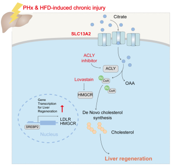 肝细胞分裂的代谢需求是肝损伤后再生的前提条件。尽管大量数据揭示了肝脏再生过程中的转录动态调控,但其与代谢重塑之间的联系仍然知之甚少。研究团队通过整合现有的转录组数据,发现膜转运蛋白SLC13A2是肝大部切除术(PHx)后肝脏再生的关键调节因子。SLC13A2的表达在PHx术后迅速降低,并随着肝脏重量和生理功能的修复而逐渐升高至正常水平。研究团队通过构建肝脏特异性过表达或缺失的小鼠模型,证明SLC13A2促进PHx术及HFD饮食长期喂养造成慢性损伤而诱导的肝再生。机制研究表明,SLC13A2转运柠檬酸,柠檬酸经ACLY催化裂解释放乙酰辅酶A用于胆固醇合成,促进SREBP2活化及胆固醇代谢相关基因(LDLR、HMGCR等)的表达。HMGCR抑制剂洛伐他汀抵消SLC13A2促进的肝脏再生。此外,ACLY抑制剂通过抑制SLC13A2介导的柠檬酸裂解,抑制胆固醇合成,阻遏肝细胞增殖和肝脏再生。研究团队由此提出,由SLC13A2转运的柠檬酸作为中间代谢物恢复肝脏再生的代谢平衡,有望成为减轻肝损伤、促进肝修复的潜在药物靶标。