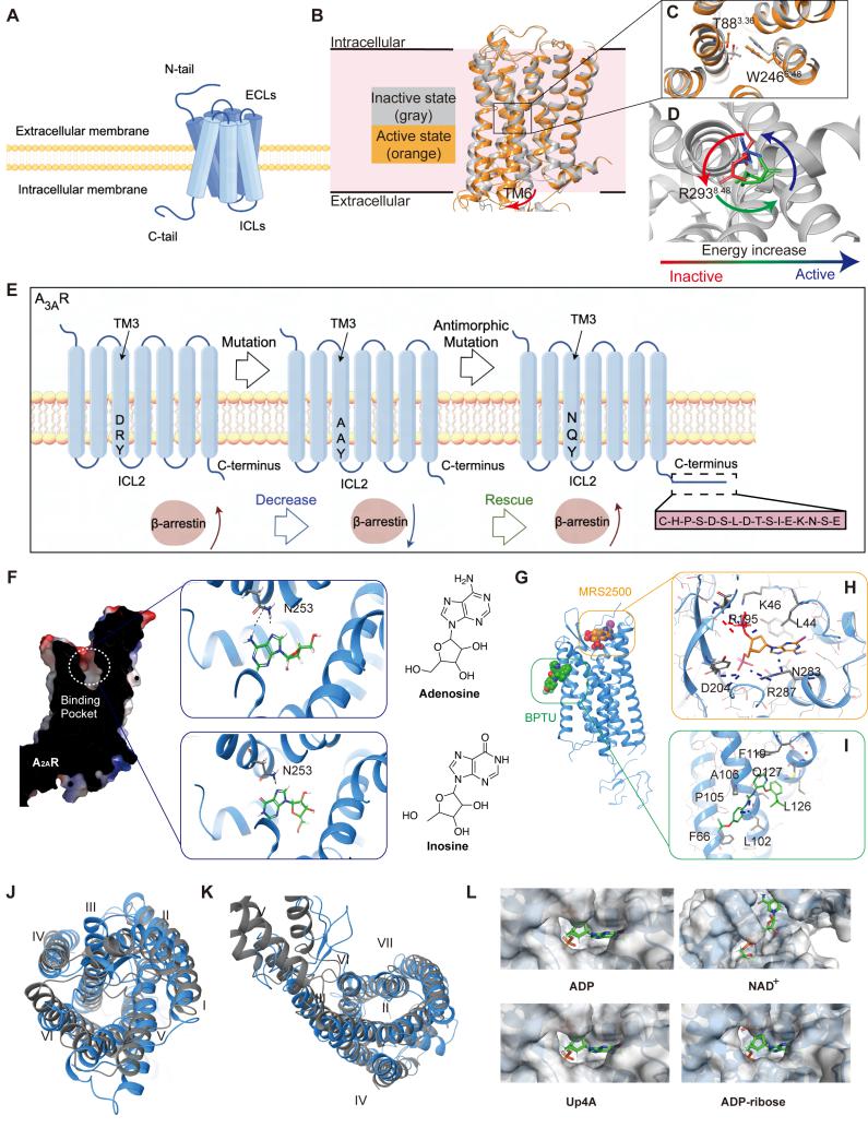 图 1.嘌呤能 GPCR 的结构与其偏向性信号转导的关联