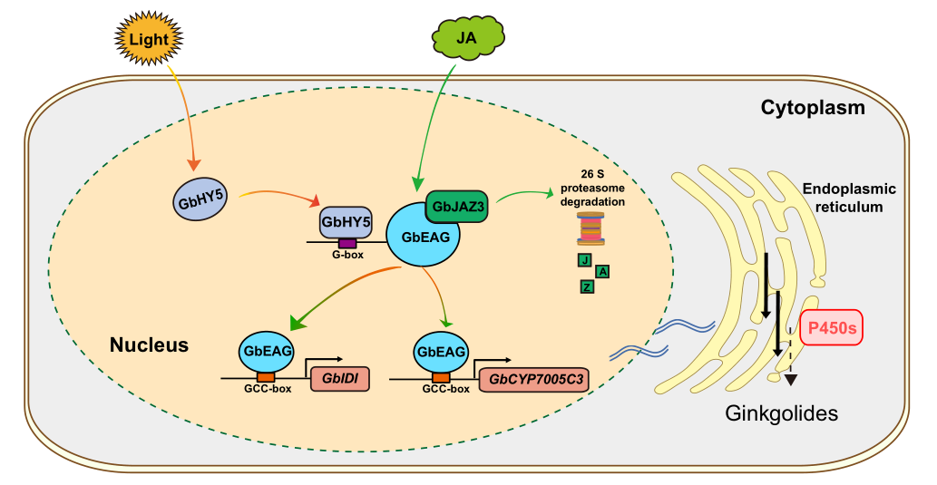 团队研究鉴定了一个由AP2/ERF类转录因子GbEAG及其互作蛋白JA信号成员GbJAZ3和光信号成员GbHY5三者组成的分子模块,作为银杏内酯生物合成的关键调控枢纽。通过系统解析,作者发现这些蛋白通过整合组织特异性JA与光信号,激活银杏内酯生物合成途径基因,从而协同调控银杏根中银杏内酯的生成。这一发现不仅为通过分子育种及基因编辑技术提升银杏内酯含量,进而防治心脑血管疾病提供了坚实的理论基础,同时也为解析环境因素与激素信号相互作用在中药材道地性形成过程中的机制提供了重要证据。