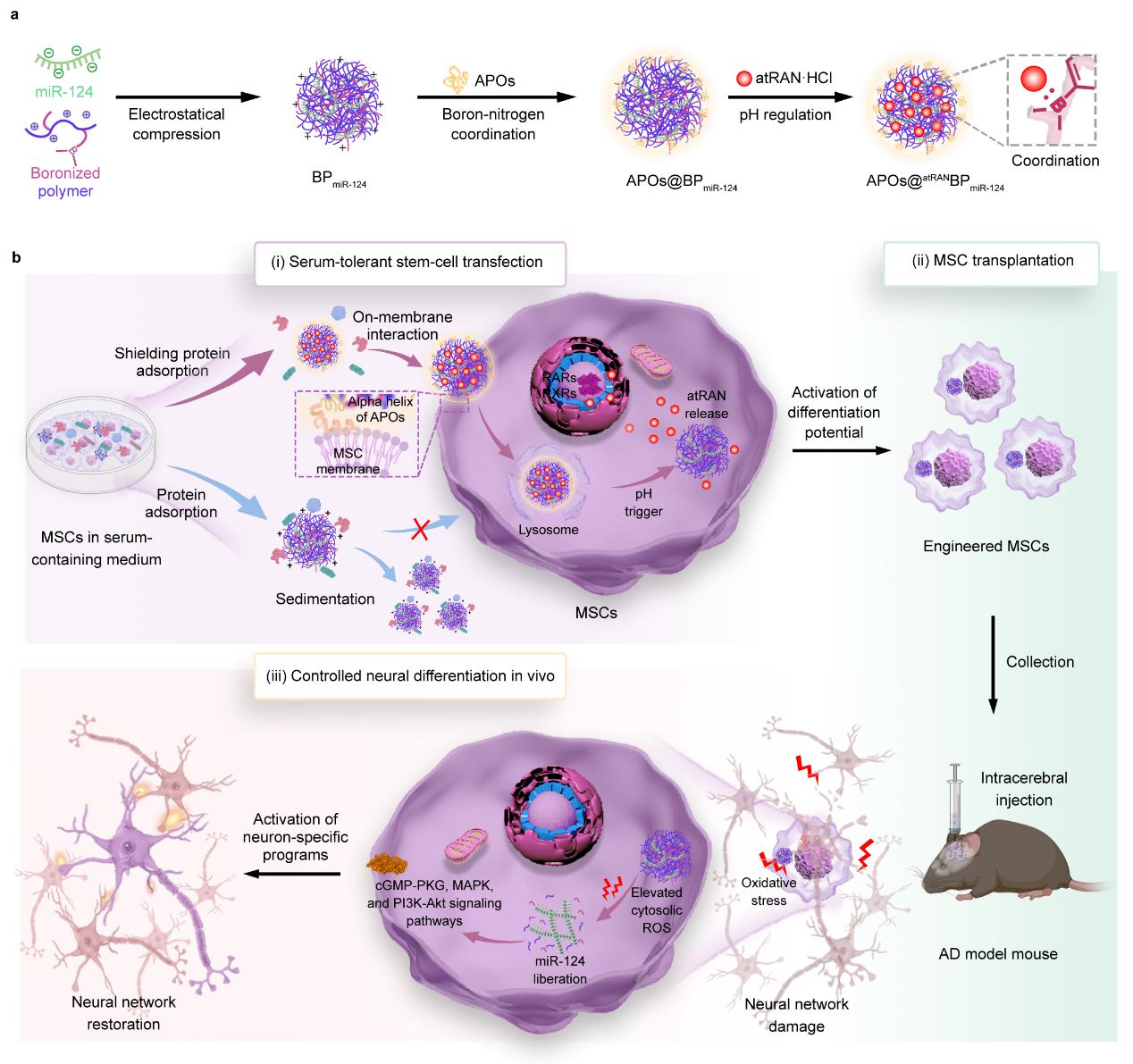 研究团队通过解析蛋白冠功能组分、引入APOs修饰,开发了一种兼具血清耐受性与膜亲和性的干细胞转染纳米系统(APOs@BP),成功实现了在含血清培养条件下安全、高效的干细胞转染。基于此,针对干细胞神经分化时序调控需求,共载促分化剂全反式维甲酸衍生物和内源神经源性关键因子miR-124,利用pH/ROS响应性时序释放机制,依次激活MSCs分化潜能与神经发生通路,稳控指导干细胞在体内外的高效分化,重塑脑内神经环路,为AD等中枢系统疾病治疗提供了新思路和新方案。