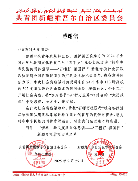 近日,团新疆区委学校工作部、新疆学联向beat365团委发来感谢信,对beat365“我是一颗石榴籽,民族团结我践行”社会实践团队在2024年全国大学生暑期文化科技卫生“三下乡”社会实践活动“铸牢中华民族共同体意识——‘石榴籽 祖国行’”新疆专项社会实践活动的突出表现予以表扬和感谢。