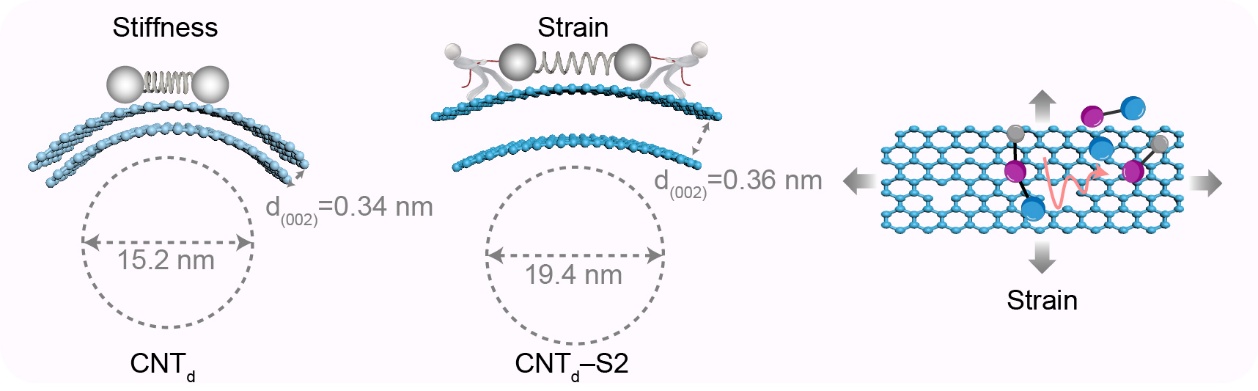 水体中药物等新污染残留造成了全球性的环境污染问题,引起了国家高度重视。在非均相高级氧化技术中,碳纳米管(CNT)改性策略有助于提升水体修复过程中的催化性能。受此启发,该研究首次揭示了应变缺陷位点对氯化反应的调控作用。研究发现,拉伸应变的sp2杂化C-C键缺陷位点显示出更强的自旋-晶格弛豫,与自由氯分子通过初始的Yeager型吸附,从而产生强化的电子交互性,可以显著提高氯化过程中对活性物种的析出与调控能力。实验结果表明,高选择性ClO•的比例从传统基于缺陷体系中的38.8%提升至由应变主导的87.5%,有效促进了2,4-二氯苯酚(2,4-DCP)的无害中间体生成以及深度矿化。这项研究结果揭示了应变效应在水体药物降解过程中的关键作用。