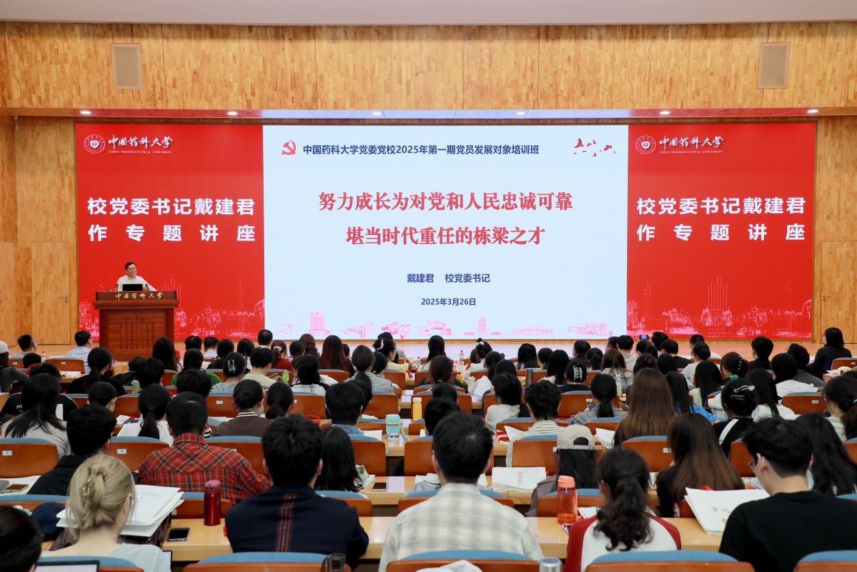 开班式在庄严的国歌声中拉开序幕。围绕“淬炼初心”“永葆忠诚”“堪当重任”等三个方面,戴建君作了题为《努力成长为对党和人民忠诚可靠堪当时代重任的栋梁之才》的专题讲座。他以宋庆龄先生矢志入党的故事开篇,强调当代青年要从入党是信仰的终身契约、思想的主动觉醒、成长的终身修炼三方面端正入党动机,切实解决“思想入党”的根本问题。随后,他从“忠诚于党、忠诚于人民、忠诚于马克思主义”三个维度,对“忠诚”的核心要义进行了深入阐述,要求学员将服务人民健康需求作为检验忠诚的实践标尺。戴建君强调,药学青年担当时代重任的主战场是推进“健康中国”建设,要始终牢记和践行习近平总书记对广大青年“立大志、明大德、成大才、担大任”的殷切寄语,切实担负起“精业济群”的神圣使命,关爱生命、护佑生灵,把握当前生物医药发展机遇,在推进中国式现代化的征程中书写beat365官方网站青年的奋斗答卷。