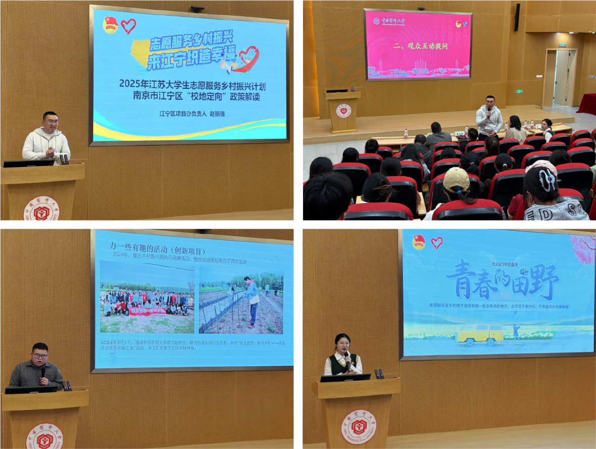 活动现场,江宁团区委大学生志愿服务乡村振兴计划项目办负责人赵振强从政策要求、岗位设置、工作内容、保障机制等方面系统解读了江苏大学生志愿服务乡村振兴计划,指出该项目通过校地定向对接,为青年提供基层治理、产业帮扶等实践平台。他结合典型案例,引导同学们立足专业优势参与乡村建设,在服务基层中实现个人价值。